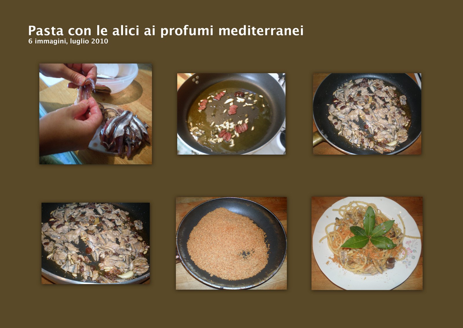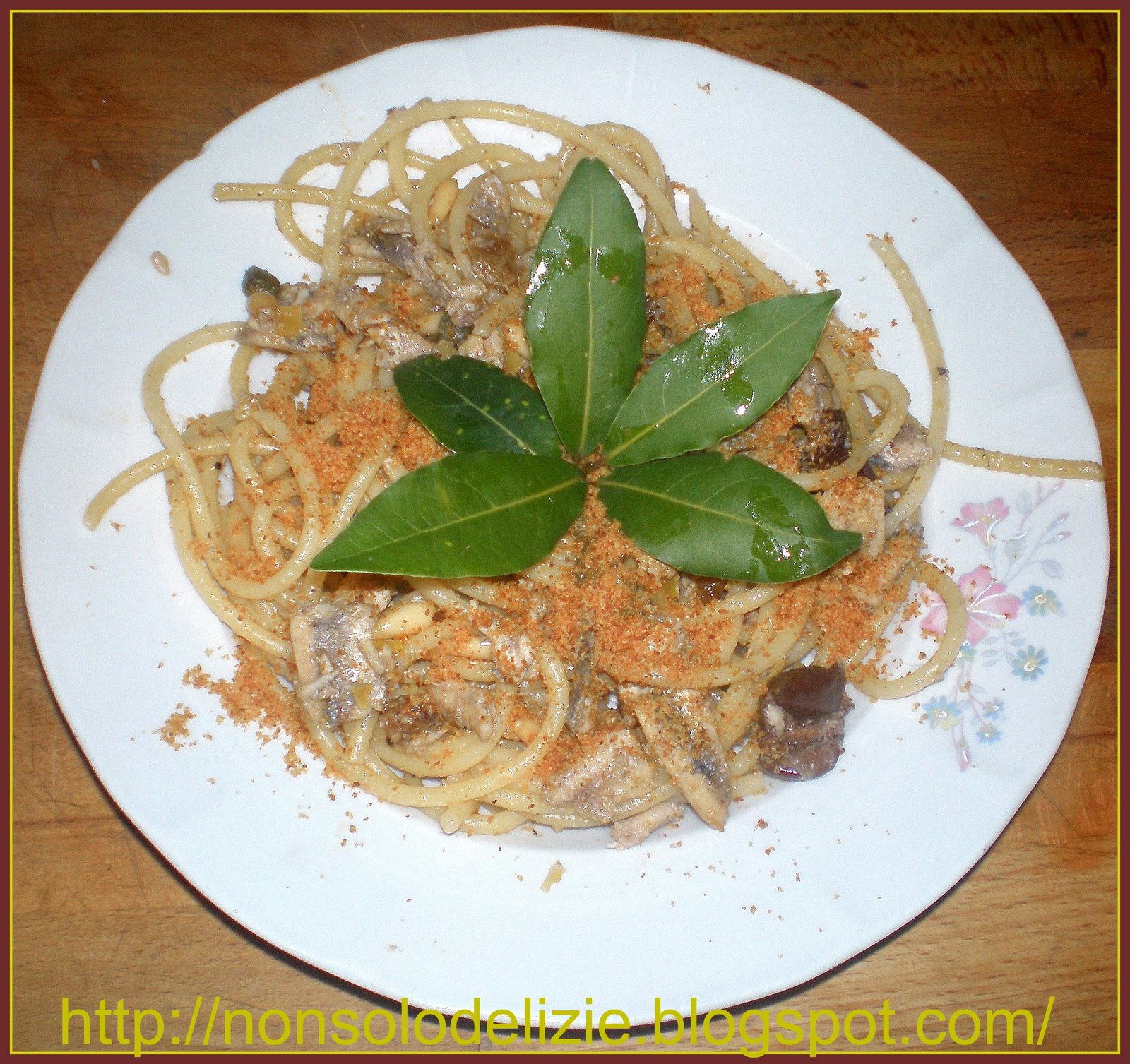 Pulire le alici e spinarle. In una padella antiaderente, tostare il pangrattato con un filo d'olio finché non raggiunge un colore dorato. In un'altra padella antiaderente versare un poco d'olio extravergine d'oliva, aggiungere lo spicchio d'aglio e farlo dorare. Fatto ciò, eliminare l'aglio ed aggiungere le olive, i capperi, i pinoli, l'uva passa sgocciolata (fatta precedentemente ammollare in acqua tiepida), il sale, il pepe, 2 foglie fresche di alloro e fare insaporire il tutto per qualche minuto. Quindi mettere le alici tagliate a pezzi grandi e farle rosolare finchè assumano un colore rosato. Contemporaneamente mettere a cuocere la pasta; una volta raggiunta la cottura (deve essere piuttosto al dente) scolarla tenendo da parte un poco di acqua; versarla in padella con l'aggiunta del brodo granulare, della buccia di limone (solo la parte gialla, 3 o 4 fettine ricavate col pelapatate) tagliata a julienne e poi a quadratini piccolissimi e di 2 o 3 mestoli di acqua. Completare la cottura aggiungendo dell'altra acqua solo se necessario. Versare nel piatto di servizio, cospargere con il pangrattato dorato, un filo d'olio a crudo e decorare con qualche foglia di alloro e qualche strisciolina di limone. Consumare calda.
