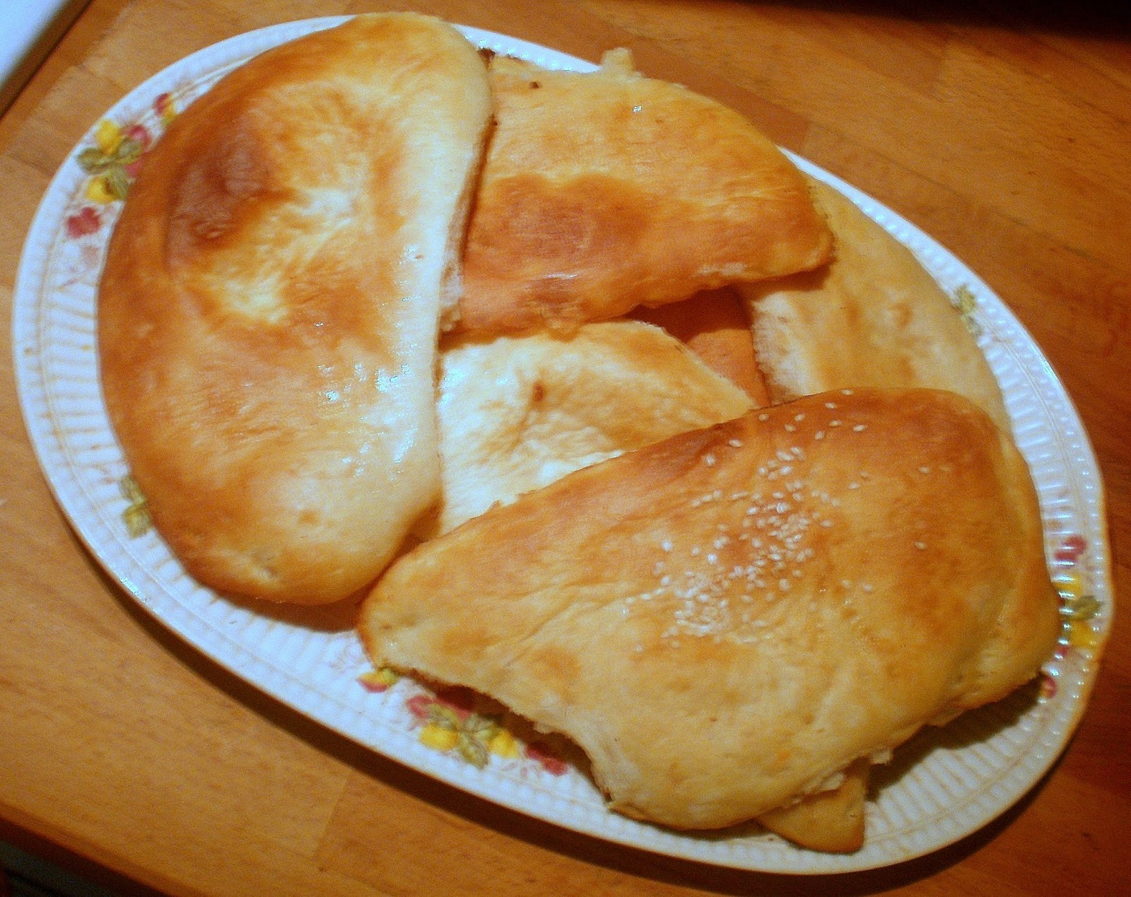 Su una spianatoia mettere la farina a fontana ed al centro il lievito sbriciolato, lo zucchero ed una parte dell'acqua; iniziare ad impastare raccogliendo, poco per volta la farina a giro, aggiungendo l'acqua fino al raggiungimento di un impasto morbido e molto elastico (sbattere spesso la pasta durante la lavorazione per consentire ed agevolare la formazione della maglia glutinica legata alla reazione del lievito con la farina); quando questa operazione sarà completata, mettere il composto in un contenitore molto capiente e lasciare lievitare in luogo tiepido per circa 2 ore. Trascorso il tempo lavorare di nuovo l'impasto per 10 minuti circa quindi formare una specie di salame e tagliarlo in 25 parti tutte uguali e formare con ciascuna di esse una pallina. Spolverare la spianatoia con la farina e stendere ciascuna pallina dandole una forma rotonda dello spessore di circa 5 mm. per 15 cm. di diametro. Posizionare ogni cerchio sull'apposito attrezzo per calzoni ( in mancanza si possono realizzare anche a mano), mettendo al centro pezzetti di fior di latte e di prosciutto ed una macinata di pepe fresco. Piegare a metà sigillando bene tutto il bordo (se necessario aiutarsi con una spennellata di acqua) per evitare la fuoriuscita del ripieno in cottura. Ungere le teglie con un filo d'olio e posizionare i calzoni distanziati uno dall'altro (per permettere loro di aumentare di dimensione durante la seconda lievitazione) e far lievitare finché non avranno raddoppiato il loro volume. Spennellare i calzoni con i tuorli d'uovo sbattuti leggermente insieme alla panna e cospargerne la superficie con i semi di sesamo. Cuocere in forno preriscaldato a 200° fino a che non risultino ben dorati