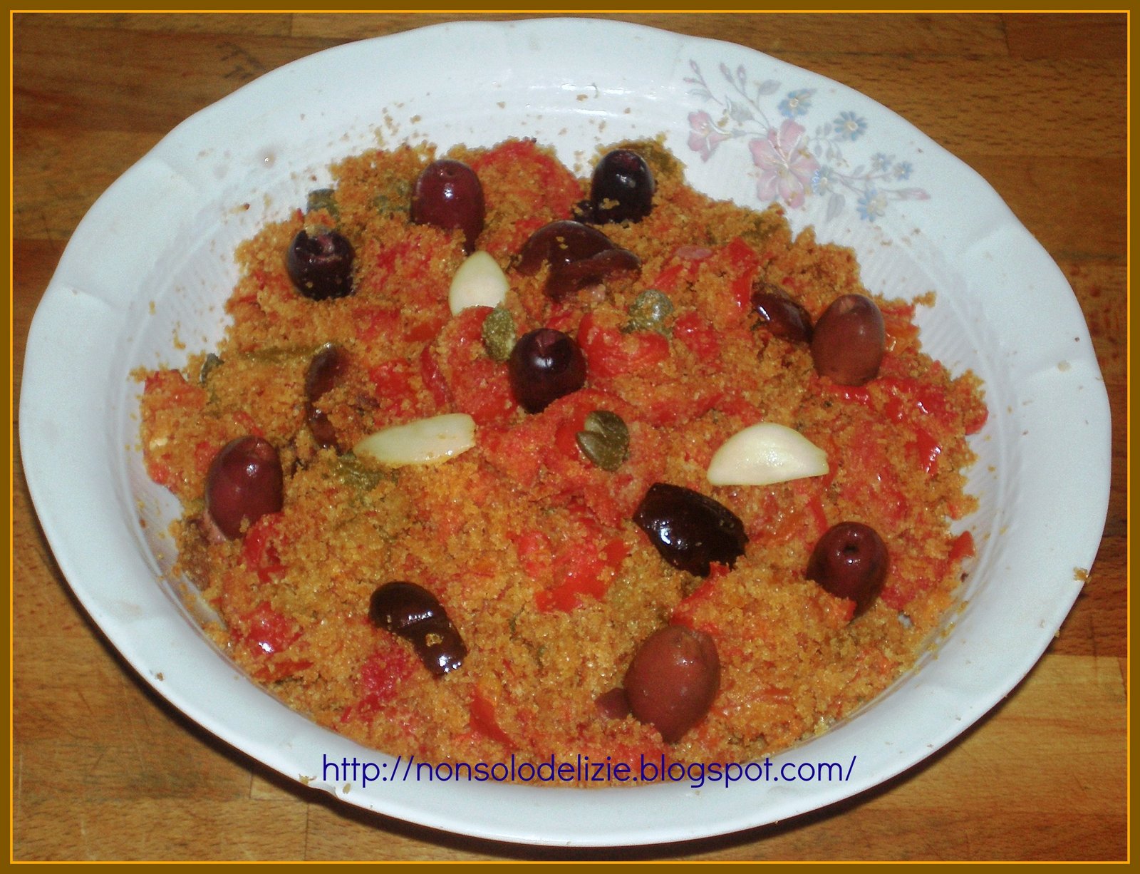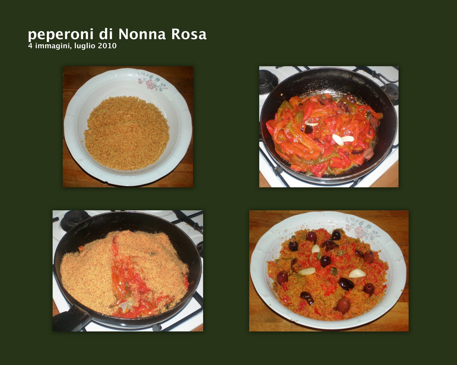 Lavare i peperoni e passarli sulla brace a fiamma viva finché non si anneriscono completamente (o se non è possibile, passarli in forno); metterli in un contenitore profondo e coperto finché non si ammorbidiscono e poi privarli totalmente della pelle. In una padella mettere il pangrattato a tostare sul fuoco; quando avrà assunto un colore dorato bagnarlo a filo con dell'olio extravergine d'oliva e farlo dorare per altri 2 minuti circa, quindi metterlo in un piatto fondo a raffreddare. Nella stessa padella di cottura del pangrattato mettere i peperoni, precedentemente spellati e tagliati a striscioline e farli cuocere per 5 minuti circa affinché perdano il loro liquido. Quando risultano ben asciutti, aggiungere un filo d'olio, olive, capperi, aglio privato dell'anima interna ed un pizzico di sale e far rosolare il tutto per altri 5 minuti. Per ultimo unire il pangrattato tostato precedentemente ed amalgamare il tutto. Porre in un piatto di servizio e decorare a piacere con olive, capperi e striscioline di peperoni arrotolati. Gustare anche freddi.