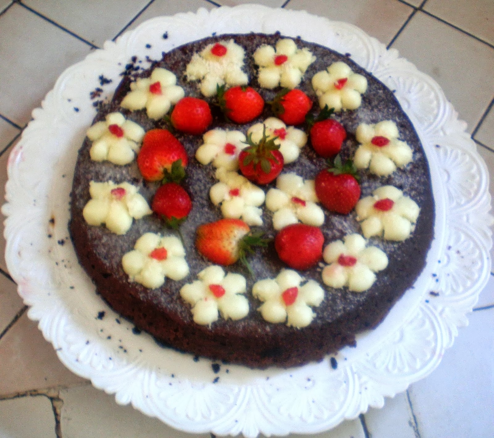 Montare il burro con lo zucchero a velo fino ad ottenere un composto cremoso e ben liscio; unire poco per volta le uova intere, la farina di cocco ed il cacao in polvere. Far sciogliere il cioccolato fondente a bagnomaria oppure in forno a microonde avendo l’accortezza di non farlo bruciare. Montare a parte gli albumi con lo zucchero semolato. Aggiungere alla montata di burro, prima il cioccolato fuso e per ultimi gli albumi montati a neve ferma (per ottenere un risultato ottimale, nel montarli aggiungere un pizzico di sale e qualche goccia appena di limone), mescolare con una spatola lentamente dal basso verso l’alto quindi mettere il composto in una teglia precedentemente imburrata ed infarinata. Infornare a 180° per una mezz’ora circa (controllare che la torta risulti umida all’interno ma cotta ). Far raffreddare prima di sformare. Servire su un piatto di servizio cospargendo la superficie di zucchero a velo. Decorare con fragole e fiori di pasta di zucchero oppure a vostro piacimento.