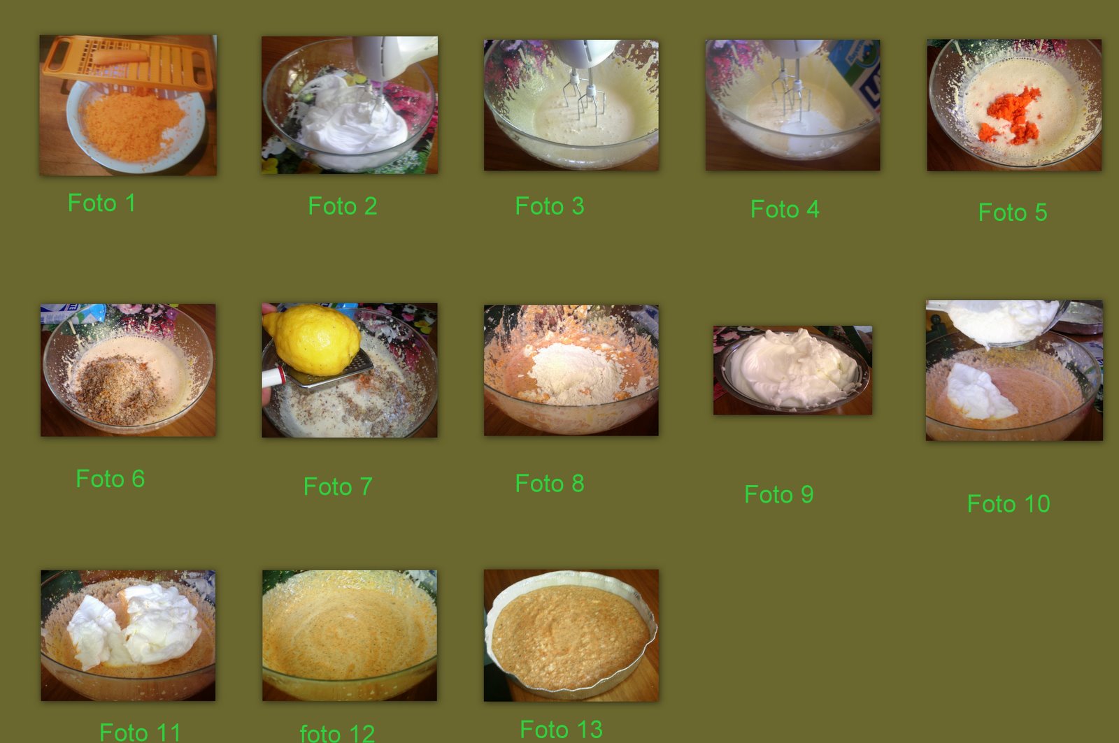 Grattugiare le carote finemente (foto 1). Montare le chiare d'uova a neve ferma con l'aggiunta di un pizzico di sale ed un poco di succo di limone (foto 2). In una terrina montare i tuorli con lo zucchero (foto 3); quando il composto sarà ben montato, aggiungere il latte per renderlo leggermente più fluido (foto 4),
