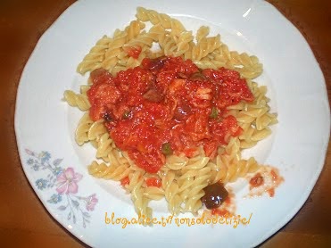 In un pentolino versare l'olio, aggiungere l'aglio privato dell'anima, le olive snocciolate, i capperi dissalati, e far rosolare quanto basta a far imbiondire l'aglio quindi, aggiungere le scatolette di tonno, dopo averle private dell'olio di conservazione, e far cuocere ancora per un minuto, dopo, unire la polpa di pomodoro, il sale, ed il pepe macinato al momento. Coprire lasciando il coperchio appena sollevato per consentire l'evaporazione dell'acqua contenuta nei pomodori. Far cuocere fino a che la salsa risulti densa. A parte cuocere la pasta. A cottura ultimata, scolare e condire con la salsa al tonno. Servire ben calda.
