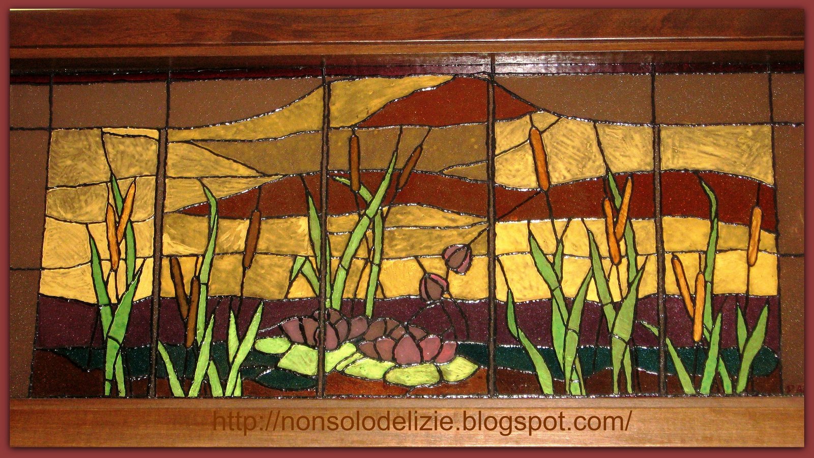 Questa vetrata sopra-porta è stata realizzata con la tecnica della falsa piombatura utilizzando i tubetti di pasta  falso piombo, colori a freddo per vetro e pennelli con punta di dimensione media per i riempimenti ed  extrafine per le sfumature.