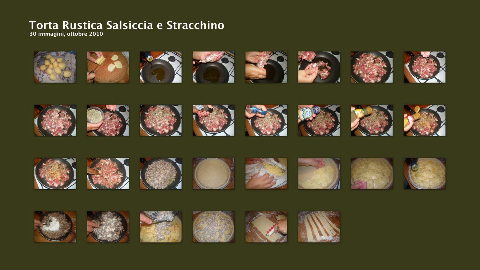 Pelare le patate, lavarle, tagliarle a rondelle sottili di 3 - 4mm. circa. e farle bollire fino a che non risultino ammorbidite. In una padella antiaderente, versare un filo d'olio, privare la salsiccia del budello e spezzettarla, insaporirla con l'aggiunta di sale, semi di finocchio, chili, curry, zenzero, e bacche aromatiche e farla rosolare bene. Quindi togliere dal fuoco ed aggiungere lo stracchino mischiando bene il tutto. Stendere la pasta brisée, tenendone un poco da parte per fare le strisce a chiusura, e foderare con essa uno stampo di 28cm di diametro; asciugare bene le patate precedentemente sbollentate e depositarle sul fondo condendole con sale, rosmarino e olio quindi, versare su di esse la salsiccia mischiata con lo stracchino. Con la pasta tenuta da parte fare delle strisce e posizionarle a chiusura incrociandole tra loro. Cuocere a forno preriscaldato a 160° per almeno mezzora, fino a che le patate risultino morbide. Se in cottura la pasta brisée esterna dovesse iniziare a scurirsi, coprire con l'alluminio e completare la cottura.