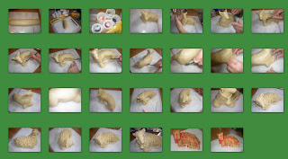 Tagliare 2/3 della pasta di mandorle a disposizione e iniziare a dare la forma decidendo la giuste proporzioni tra la testa da modellare ed il resto del corpo. Aiutarsi con gli attrezzi per ceramica per lisciare e togliere le parti in eccesso e per migliorare i dettagli. Aggiungere dei pezzi di pasta per modellare la zampa anteriore a riposo, e continuare dando forma allo zoccolo, quindi modellare la coda, la pancia, la zampa posteriore, la parte posteriore; aggiungere un altro pezzo di pasta per la zampa anteriore posta sotto al corpo, e completare lisciando bene ogni parte ed ogni piccolo dettaglio, dando la giusta rotondità e profondità. Con una punta per pasticceria rigata, segnare tutto il corpo con strisce tipo esse, quindi iniziare ad aggiungere i dettagli del vello, formando dei sottilissimi cordoncini, arrotolandoli su se stessi ed attaccandoli alle varie parti del corpo. Sempre con la pasta di mandorle fare una campanella ed un nastro per legarla al collo dell'agnello, quindi completare i cordoncini di lana sul vello. A conclusione colorare con colori alimentari diluiti nell'alcool puro in piccole dosi.