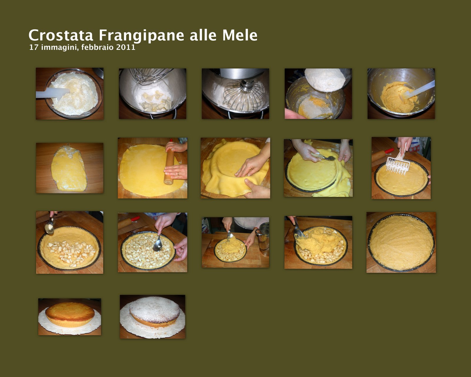 Lavare e sbucciare le mele, tagliarle in piccoli cubetti, metterli in una ciotola, spolverizzarle con lo zucchero semolato ed il succo di limone e farle macerare per una decina di minuti; intanto preparare a parte il frangipane, montando il burro morbido a temperatura ambiente insieme allo zucchero a velo, aggiungendo le uova e per ultime le farine mescolate insieme (prima di mischiarle setacciate la farina 0), ed impastando fino ad ottenere un composto omogeneo. Tenere da parte. Stendere la pasta frolla nello spessore di 5mm. circa, rivestire la tortiera anche sui bordi, tagliare la pasta eccedente a circa 1cm. dal bordo, bucherellare il fondo per evitare che si formino delle bolle in cottura, versare le mele privandole del liquido che nel frattempo si è formato durante il riposo, distribuendole uniformemente,e ricoprire il tutto con il frangipane preparato precedentemente. Infornate a 170° per circa 30 minuti. Quando la superficie risulterà ben dorata, uscitela dal forno e mettetela a raffreddare. Quando si sarà completamente raffreddata, toglietela dallo stampo, mettetela su un piatto di servizio e spolveratela abbondantemente con lo zucchero a velo vanigliato. Servite e buon appetito.