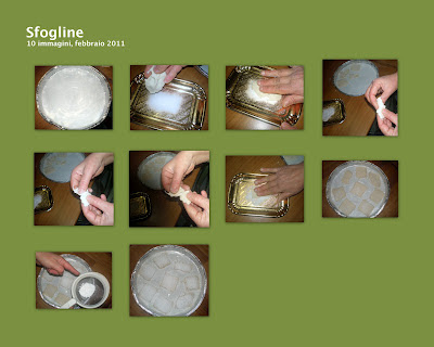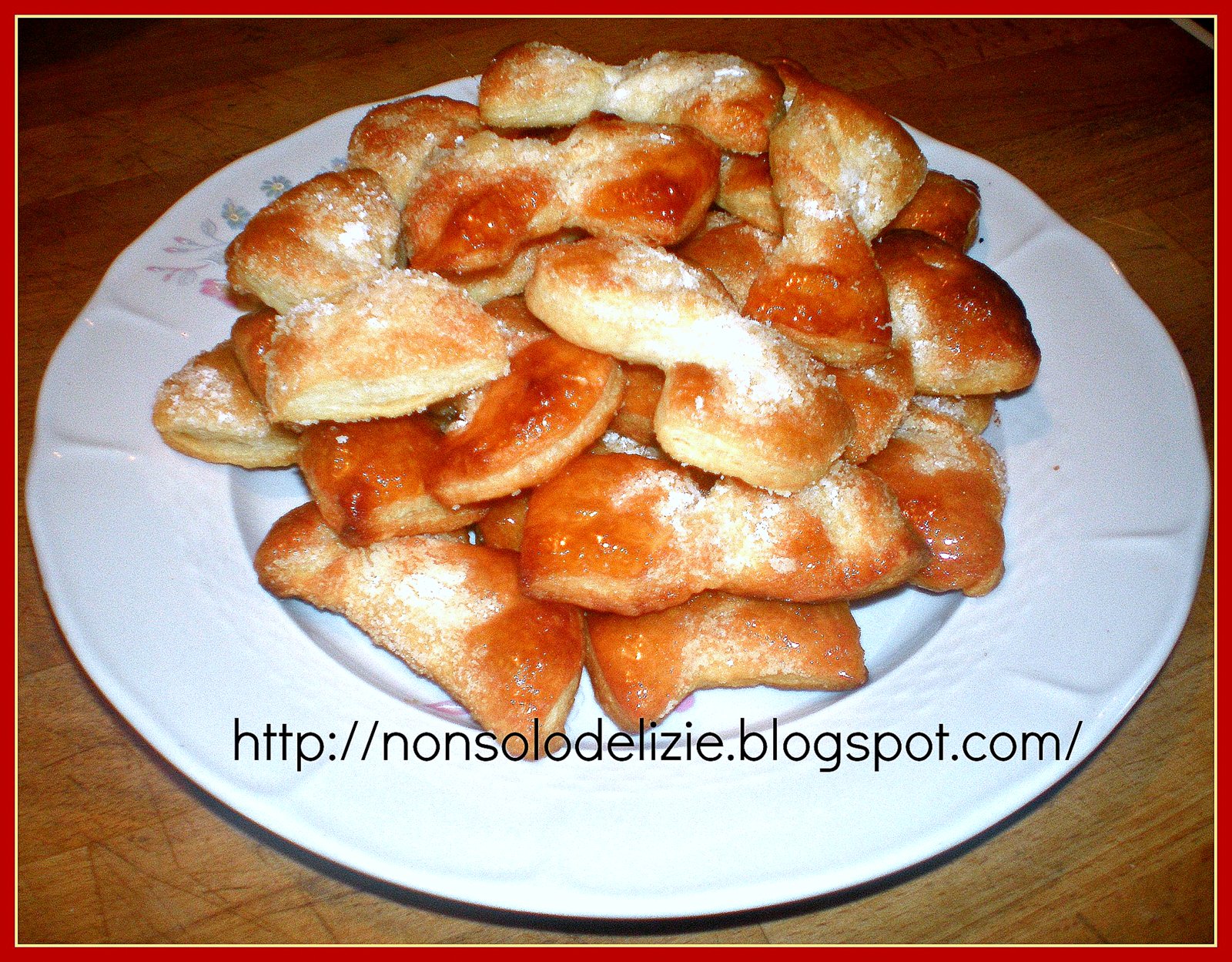 Stendere la pasta sfoglia, in forma rettangolare, dello spessore di 7mm circa. Tagliare delle strisce. tutte uguali, di 4cm. di larghezza, ed a sua volta, tagliare ciascuna striscia in rettangoli di 6cm. ognuno. A questo punto applicare una torsione al centro di ciascun rettangolo, dandogli così la forma di un fiocco (ovviamente, la forma non è determinante, potete scegliere voi stessi quella che più vi aggrada!). Preparare, intanto, delle teglie imburrate e spolverizzate di farina, quindi, prendere ciascun "fiocco" di pasta sfoglia, passare la superficie superiore nello zucchero semolato, premendo leggermente per farlo aderire, e sistemarlo nella teglia, distanziandolo uno dall'altro per permettergli di crescere durante la cottura senza attaccarsi al successivo. Quando avrete finito di preparare tutte le sfogline, spolverizzate abbondantemente con lo zucchero a velo la superficie che precedentemente avevate ricoperta di zucchero semolato, quindi cuocete a forno preriscaldato a 200°, per circa 10 minuti, giusto il tempo necessario alla doratura della superficie (quando lo zucchero semolato avrà creato il caramello, le sfogline saranno pronte). Fate raffreddare prima di servire.