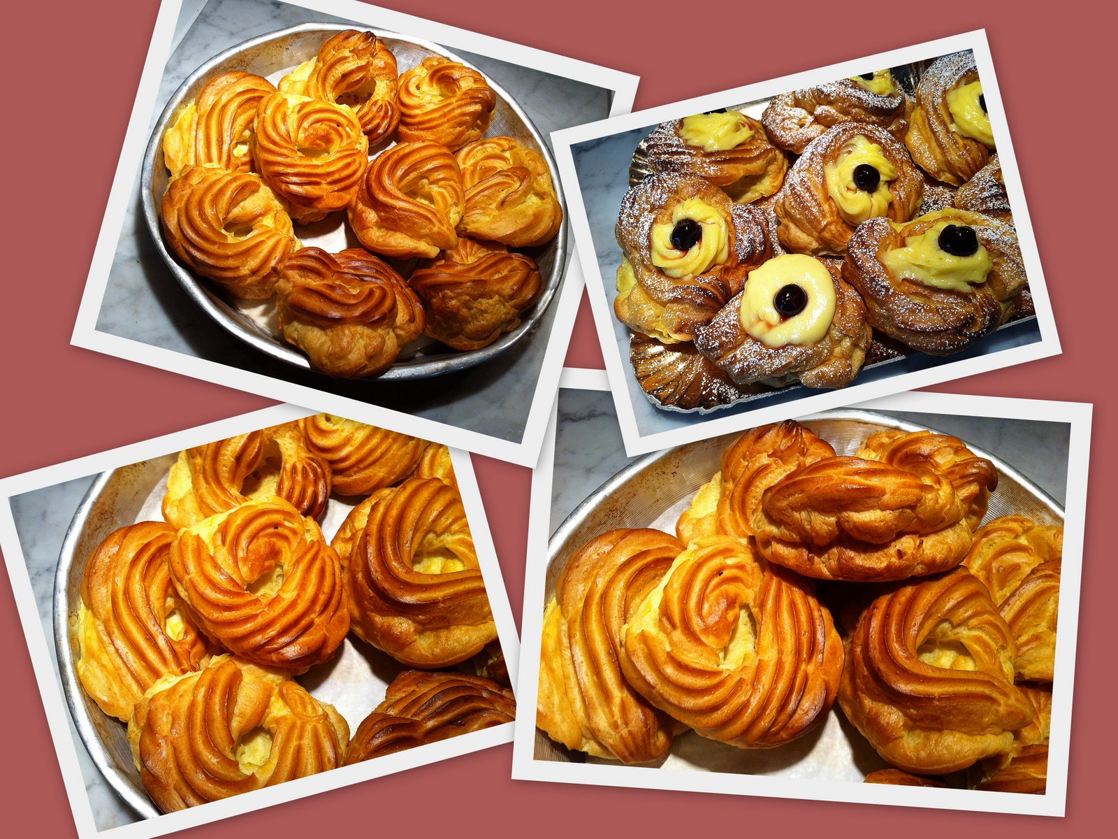 Preparare la pasta con lo stesso procedimento della pasta per bignè, mettendo a bollire l'acqua, il burro ed il sale e lo zucchero. Quando il tutto sarà in ebollizione, versare la farina tutta insieme e girare con un cucchiaio di legno fino a far formare una palla unica. Cuocere ancora per alcuni minuti, per fare ulteriormente asciugare il composto, quindi togliere dal fuoco, versare nella planetaria con la foglia e far girare per qualche minuto per fare intiepidire l'impasto, quindi cominciare ad aggiungere le uova, uno per volta fino al completo assorbimento di ciascuno. Fatto ciò, rivestire una teglia con carta da forno e su di essa, con l'ausilio di un sac a poche munito di bocchetta grande rigata, formare le zeppole dando loro la forma di due cerchi sovrapposti, distanziate una dall'altra per permettere loro di gonfiare durante la cottura. Infornare a 220° con forno preriscaldato per 25 minuti circa, fino a che non risultino ben dorate in superficie, quindi spegnere il forno, aprire un poco il suo sportello e farle raffreddare al suo interno. A parte preparate la Crema Pasticcera e fatela raffreddare. Praticate il foro sotto ciascuna zeppola e con l'aiuto di un sac a poche munito di bocchetta liscia, riempite di crema. Sistemate le zeppole su un vassoio, fate sopra ciascuna un ricciolo di crema, al centro mettete una punta di confettura ed una amarena, spolverizzate con zucchero a velo e servite.
