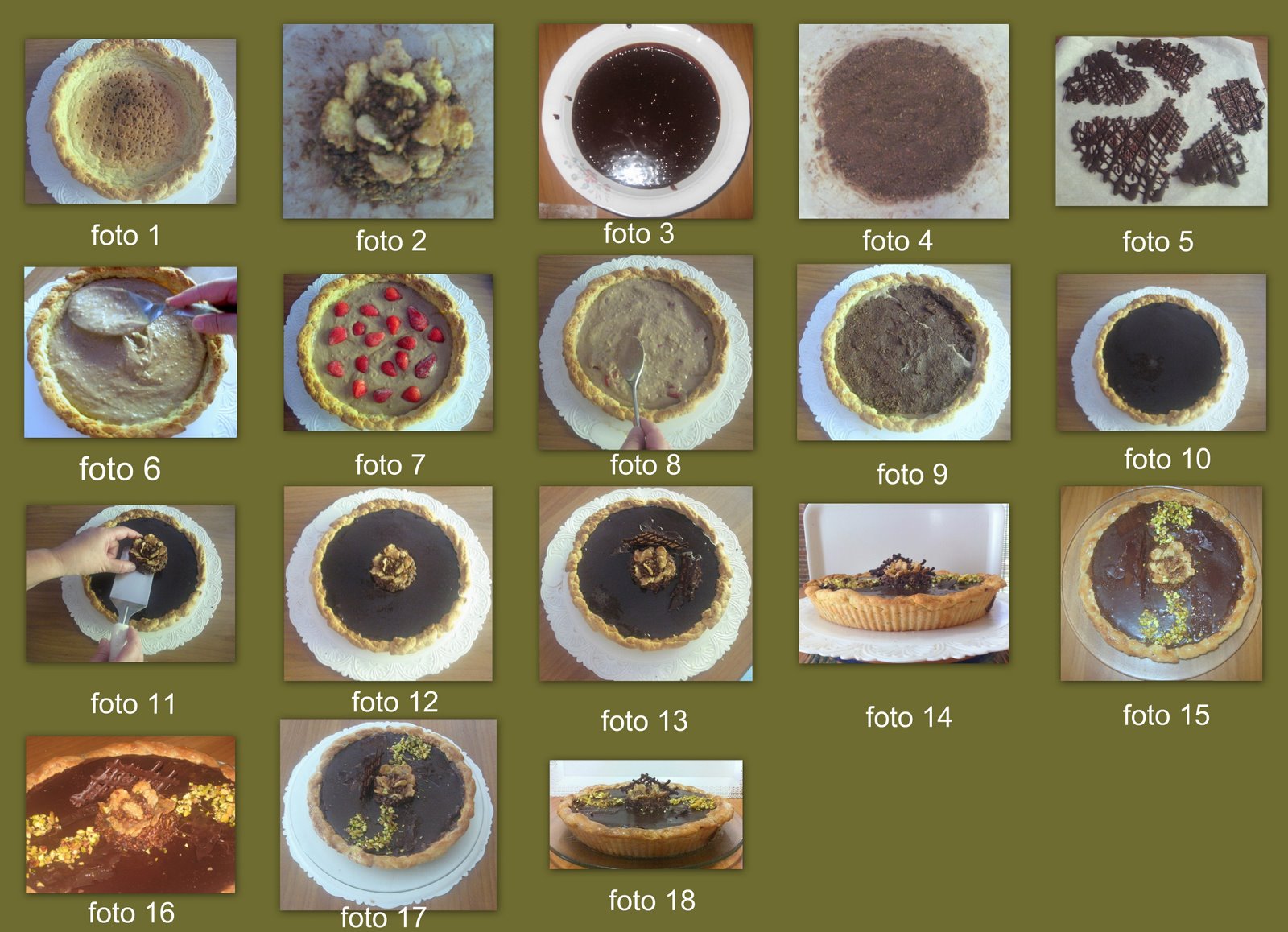 Comporre il dolce inserendo un primo strato di crema pasticcera al cioccolato all’interno della frolla (foto 6), distribuendo sulla sua superficie le fragole tagliate a metà (foto 7), ricoprendole con un sottile strato di altra crema al cioccolato (foto 8); inserire, a questo punto, la cialda croccante di cioccolato (foto 9) e ricoprire il tutto con la ganache al cioccolato e miele (foto 10). Porre a raffreddare in frigorifero per circa un’ora, quindi posizionare al centro della crostata la rosa di cereali (foto 11 e 12) ed a fianco ad essa in piedi la griglia trapezoidale di cioccolato fondente (foto 13 e 14). Ai lati della rosa formare due "S" con i pistacchi sminuzzati (foto 15 e 16). Infine, gelatinare la frolla per bene. Questo è il risultato finale (foto 17 e 18). Questa crostata è ideale come dessert di fine pasto.