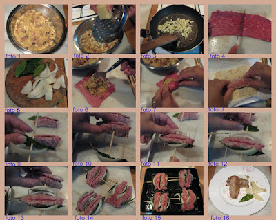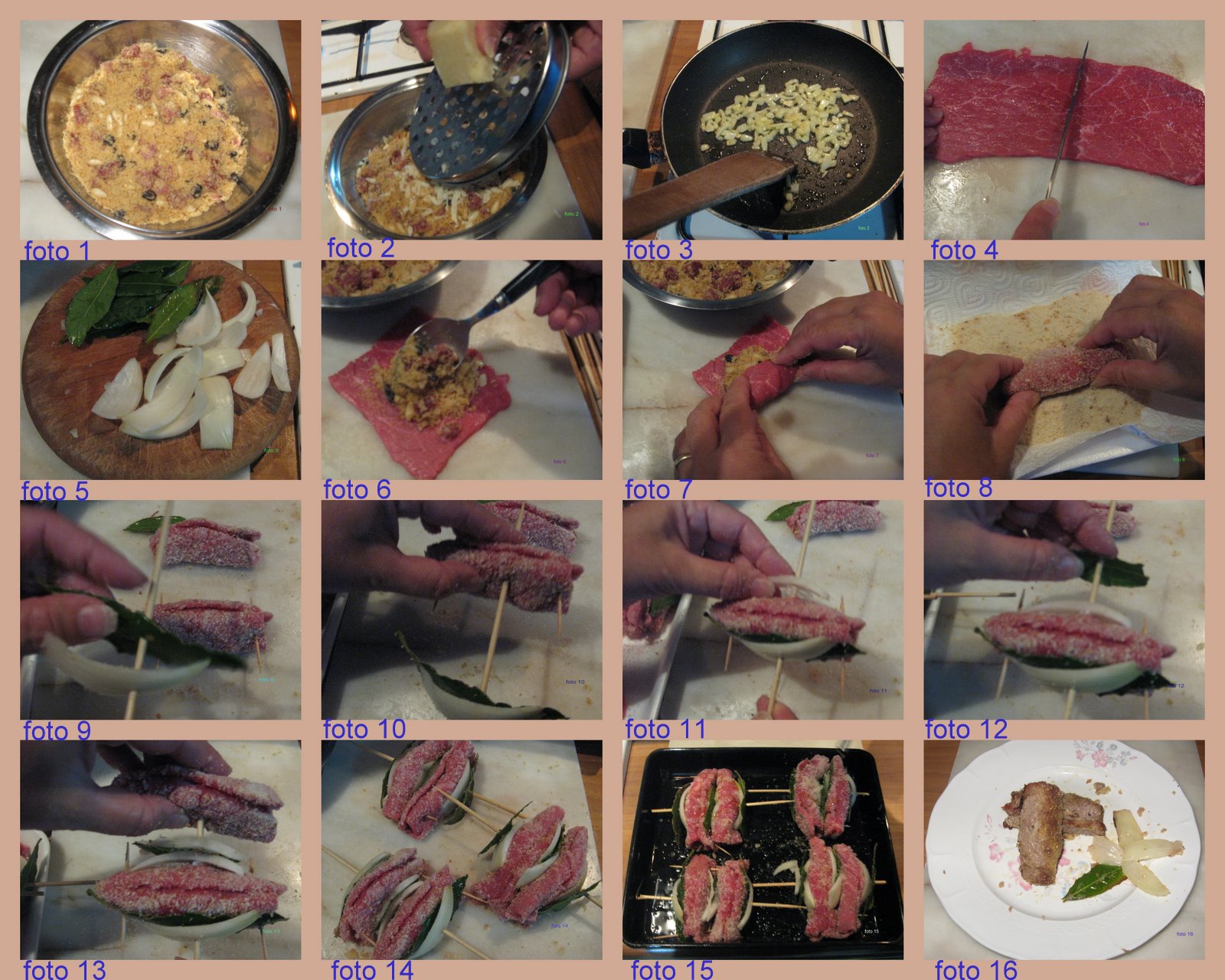 In una padella antiaderente, far tostare 100g. di pangrattato con l'olio,fino a che non risulti ben dorato, e metterlo in una ciotola capiente. Ad esso aggiungere l'uva passa, lavata e ben strizzata, i pinoli, il sale, il pepe, il salame tagliato a cubetti (foto 1) ed il pecorino a scaglie(foto 2). Completare il ripieno aggiungendo un pezzetto di cipolla tagliata a piccoli pezzetti e fatta imbiondire con un poco d'olio extravergine d'oliva (foto 3). A questo punto, prendere le fette di carne e tagliare le fette a metà (foto 4); lavare ed asciugare le foglie di alloro e la rimanente cipolla a strisce larghe (foto 5). Mettere al centro di ogni fettina di carne un cucchiaio di ripieno preparato precedentemente (foto 6), arrotolarla su se stessa (foto 7), chiudendo le estremità con gli stuzzicadenti e passare l'involtino così ottenuto nel rimanente pangrattato (foto 8). Allo stesso modo preparare tutti gli altri involtini. Realizzare, gli spiedini mettendo prima la cipolla, poi una foglia di alloro (foto 9), quindi il primo involtino (foto 10), nuovamente una foglia di alloro ed un pezzo di cipolla (foto 11 e 12), completare con lo stesso ordine di ingredienti anche il secondo involtino (foto 13). Quando avrete fatto tutti gli spiedini (foto 14), ungete una teglia e dopo averli sistemati al suo interno (foto 15), bagnatene la superficie con un filo d'olio. Cuocete a 180° per circa 20- 25 minuti. Servire ben caldi (foto 16).