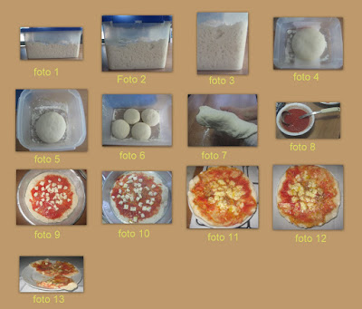 Prima cosa da fare quando si vuole usare il Lievito Madre è la sua preparazione che consiste nel rinfrescarlo tutte le volte che necessita e cioè fino ad ottenere il suo raddoppio di volume in circa 4 ore, a temperatura ambiente. Io, quindi, mi anticipo questa fase al giorno prima così da averlo pronto per la mattina del giorno successivo. A questo punto il lievito è pronto per essere usato. Mettere in planetaria col gancio il Lievito Madre insieme all’acqua, e farlo sciogliere, quindi, continuando ad impastare a velocità minima, aggiungere la farina, poco per volta, fino alla totale utilizzazione. Aumentare la velocità al massimo e quando l’impasto risulterà bene incordato, aggiungere il sale e continuare ad impastare fino a che non si stacchi del tutto dalle pareti. A questo punto, togliere dalla planetaria e trasferire il composto su una spianatoia leggermente infarinata e arrotolarlo su se stesso fino ad ottenere una palla ben liscia ed omogenea. Mettere a riposare in un contenitore ermetico spolverizzato di farina e chiuso per mantenere la giusta umidità, fino a che non vedrete l’impasto raddoppiare di volume, quindi rimetterlo sulla spianatoia infarinata, tagliarlo in 8 parti tutte uguali e con esse formare delle palline. Rimettere a lievitare in un contenitore ermetico, leggermente distanziate una dall’altra per permettere la giusta lievitazione (se non ne possedete uno capiente in grado di contenerle tutte, fate come me, potete usare tanti contenitori tipo le vaschette del gelato, ovviamente spolverizzate di farina). Trascorse almeno 3 0 4 ore ( i tempi sono sempre relativi perché sono legati alla temperatura del luogo di lievitazione), spolverizzate la spianatoia, prelevate ciascuna pallina d’impasto e schiacciatela girando sempre l’impasto per dargli la classica forma rotonda da pizzeria, trasferitela in una teglia leggermente oleata, conditela con pomodoro, provola affumicata a cubetti, sale, basilico ed un filo di olio su tutta la superficie (potete anche scegliere condimenti diversi, secondo il vostro gusto, ad esempio origano al posto del basilico e mozzarella classica al posto della provola, con i funghi, con i peperoni, ecc.) e quindi cuocete a forno preriscaldato a 250° per circa 7 / 8 minuti, (la cottura e la temperatura del forno è sempre relativa e legata al proprio forno, quindi, direi, regolatevi nel seguente modo: riscaldate il forno al massimo ed infornate fino a che la pizza non risulti ben dorata). Il risultato è eccellente!