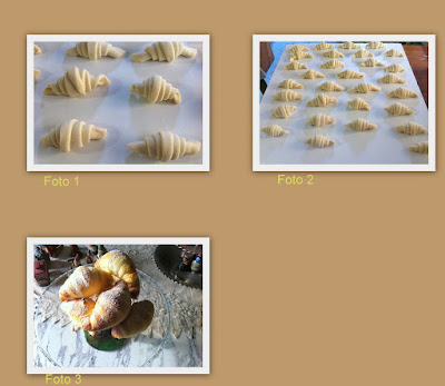 Nella ciotola della Planetaria, sciogliere il Lievito Madre col latte tiepido. Azionare la macchina col gancio a velocità minima quindi aggiungere gli ingredienti secondo quest'ordine: le uova dopo averle appena miscelate con la forchetta, la farina setacciata poco per volta insieme allo zucchero e la vaniglia, e per ultimo il sale. Fare amalgamare il tutto per 10 minuti circa, quindi inserire i 20 gr. di burro ammorbidito poco per volta fino al completo assorbimento e continuare ad impastare fino a che non si stacchi dalle pareti (risulterà morbido ed appiccicoso). Trasferire l'impasto su una spianatoia spolverizzata con la farina e ripiegarlo su se stesso verso il centro dandogli la forma di una palla liscia, quindi ungere una ciotola capiente con olio evo e trasferire il composto al suo interno, coprire con pellicola, e farlo riposare per 2 ore; trascorso il tempo riprendere l'impasto e stenderlo col mattarello nello spessore di circa 5 mm. facendo una serie di pieghe di 3 per dar forza al lievito per lavorare meglio (come si fa nella fase del rinfresco prima di metterlo a riposo in frigorifero). Dopo l'ultima piega, avvolgerlo nella pellicola e metterlo in frigorifero per 12. Il giorno successivo, prendere il burro, metterlo tra due fogli di carta da forno e "picchiarlo" col mattarello per renderlo più plastico, quindi stenderlo dandogli la forma di un rettangolo la cui dimensione deve essere i 2/3 di quella che del rettangolo dell'impasto che andrete a stendere subito dopo questa operazione. Incassate il panetto di burro posizionandolo sul bordo superiore dell'impasto, piegate su di esso la parte che non contiene il burro e quindi la rimanente parte insieme al burro, questa sarà la prima piega di 3; stendete l'impasto rigirandolo al contrario e ruotandolo di 90° e fate un'altra piega da 3. Ripetete l'operazione per tre volte(3 pieghe da 3). Avvolgete nella pellicola e mettete in frigorifero per tre ore. Trascorso questo tempo fate un'altra serie di pieghe, sempre 3 da 3 e rimettete a riposo per altre tre ore dopo le quali riprendete l'impasto e fate l'ultima serie di 3 pieghe da 3. Avvolgete ancora nella pellicola e mettete a riposo in frigorifero per 12 ore. Il giorno successivo, stendete l'impasto sempre nella forma di un rettangolo dello spessore di 5 mm. circa e tagliate delle strisce di 15 cm. dalle quali ricaverete a sua volta dei triangoli isosceli allungati, tirateli con le mani per allungarli ed arrotolateli su se stessi dandogli la forma dei cornetti (foto 1 e 2). Metteteli a lievitare a 26° circa, coperti da pellicola, per tutta la notte. disponeteli sulla teglia coperta da carta da forno, spennellate la superficie con l'uovo se il latte sbattuti insieme e cuoceteli in forno preriscaldato a 190° per 15 minuti ( fino a che la superficie non risulti dorata). Sfornare e spolverizzare i croissant con zucchero a velo.