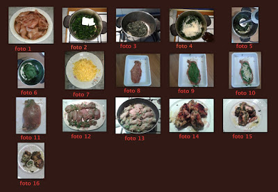 Preparate la marinata emulsionando per bene il miele con l'aceto balsamico, il sale, il pepe e i due cucchiai di olio, quindi versatela in una ciotola capiente, inserite anche i petti di pollo (foto 1) e fateli macerare per circa 4 ore in frigorifero coperti con pellicola avendo l'accortezza di rigirarli ogni tanto. Intanto fate scongelare gli spinaci e quando avranno riacquistato la loro morbidezza, metteteli a cuocere in un pentolino insieme al burro e un poco di acqua (essendo scongelati possiedono già i liquidi ma se usate gli spinaci freschi dovrete aggiungere più acqua altrimenti rischiate di bruciarli) e al sale (foto2) e quando saranno pronti (foto 3) fateli intiepidire e aggiungete il pecorino e il grana grattugiati (foto 4) , quindi frullateli fino ad ottenere una crema asciutta e spalmabile (foto 5 e 6). Contemporaneamente grattugiate l'olandese con l'ausilio di una grattugia a buchi grossi (foto 7) e quando il tempo di macerazione sarà trascorso, riprendete il pollo, stendete la prima fetta (foto 8), spalmatela con la crema di spinaci (foto 9), aggiungete un poco di olandese (foto 10), arrotolate il pollo su se stesso e fermate l'involtino con gli stuzzicadenti alle estremità (foto 11) per evitare che il ripieno fuoriesca in cottura. Procedete così per tutte le fettine di pollo (foto 12). Tenete da parte la marinatura rimasta. Friggete gli spiedini così ottenuti in una padella antiaderente con poco olio extravergine d'oliva (foto 13), a fiamma viva rigirandoli ogni tanto, fino a che risultino ben dorati quindi toglieteli dalla padella nella quale, all'olio di cottura la marinata tenuta da parte per farla restringere e caramellare. A questo punto mettete gli involtini nei singoli piatti, irrorateli con un poco di marinata (foto 14, 15 e 16) e serviteli