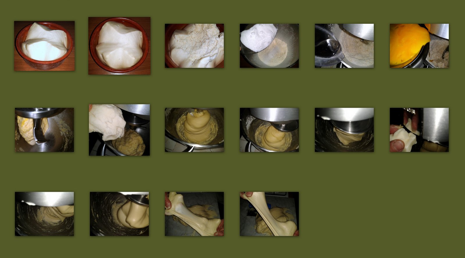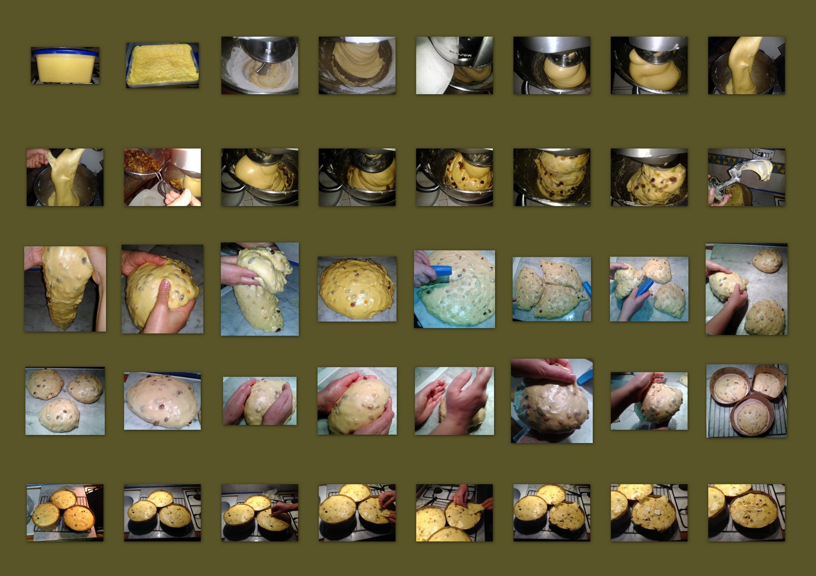 Premetto che gli ingredienti sono scritti nell'ordine in cui verranno inseriti nell'impasto. Innanzi tutto è molto importante preparare il lievito madre che useremo. Io comincio dieci giorni prima, rinfrescando giornalmente il mio lievito con la stessa farina che utilizzerò per i panettoni, per dar modo al lievito di adattarsi e rendere al massimo in fase di lievitazione. Il giorno del primo impasto rinfresco il Lievito Madre tre volte a distanza di 3 o 4 ore, controllando che in quest'arco di tempo raddoppi il suo volume, solo così sono sicura di ottenere un ottimo risultato. Le dosi per il rinfresco sono: 100 gr. di lievito (prelevare solo la parte interna, il cuore), 100 gr. di farina e 40 gr. di acqua. A questo punto la sera, intorno alle 19 faccio il primo impasto, mettendo in planetaria con il gancio e a velocità minima (mantenendola costante per tutto il processo), la farina e lo zucchero, e aggiungendo l'acqua lentamente (questo sistema vale per l'inserimento di tutti gli ingredienti, devono essere aggiunti lentamente per evitare il crollo, altrimenti l'impasto non incorderà più) e controllando continuamente che il composto non si surriscaldi; se ciò dovesse accadere, fermate fino al raffreddamento poi potete continuare. Una volta che l'impasto si sarà formato, cominciate ad aggiungere i tuorli, molto lentamente, quando saranno ben incorporati, unite il lievito madre e impastate fino a che il composto risulti perfettamente incordato. Controllate la consistenza e se dovesse risultare troppo compatto, regolate con l'acqua (i 70 gr. inserita tra gli ingredienti), e fate bene assorbire. Unite il burro in pomata a piccole quantità e non inserite il successivo se non è stato del tutto assorbito il precedente. Fate andare ancora la planetaria fino a che l'impasto non sia del tutto legato e staccato dalle pareti. Fermate la macchina, prelevate il composto e dategli 4 o 5 pieghe per arrotondarlo, quindi mettetelo in un contenitore ermetico a lievitare per 12/14 ore a una temperatura di 24° circa in una camera di lievitazione, oppure, per chi come me non ce l'avesse, in forno chiuso e spento con una pentola di acqua bollente vicino, che avrete fatto riscaldare precedentemente. La mattina del secondo giorno, la prima cosa da fare sarà mettere a bagno l'uvetta; dopo averla lavata per bene, mettetela ad ammorbidire in una ciotola con alcool puro per alimenti, o nel rhum se preferite aromatizzarla, e questo per darle modo di mantenersi morbida in cottura , di non asciugarsi troppo. Trascorse le 12 ore, il composto avrà raddoppiato il suo volume, quindi per il secondo impasto mettetelo nella planetaria dopo avere inserito la farina, e azionate la macchina; quando avrà ripreso la sua elasticità, inserite lo zucchero e quando quest'ultimo sarà stato inglobato del tutto, unite i tuorli, sempre poco per volta; fate incordare per bene e quando il composto risulterà liscio, lucido e molto elastico, unite il burro in pomata al quale avrete aggiunto i semi prelevati dalla bacca di vaniglia; con l'inserimento dell'ultimo pezzetto di burro, unite anche il sale e fate impastare fino a che avrà raggiunto nuovamente la sua elasticità e lucentezza. A questo punto potete aggiungere l'uvetta e i canditi a completare il tutto. Far riposare l'impasto ottenuto per 30/40 minuti a temperatura ambiente, quindi procedere alla pirlatura iniziando con l'ingrassare col burro il piano di lavoro e le mani, fare la pezzatura dei panettoni, dividendo l'impasto i 3 parti ciascuna da 1,100 kg., prendere il primo pezzo, fare 2 o 3 pieghe per dare rotondità, e ripetere lo stesso per gli altri due pezzi; a questo punto riprendere il primo e, pigiando l'estremità destra con la mano tesa, avvicinarlo a se e contemporaneamente, con la mano sinistra riportare la palla ottenuta di nuovo al punto di partenza; ripetere questa operazione fino ad ottenere una forma sferica perfetta e ben tesa, quindi girarla sotto sopra e stringere a chiudere la parte inferiore (potete seguire la pirlatura nelle immagini sottostanti). Posizionate nell'apposito pirottino da Panettone e coprite con pellicola per alimenti. Ripetete l'intero procedimento per ciascuno dei tre pezzi. A questo punto non resta che mettere a lievitare in forno spento e chiuso, con una pentola di acqua bollente vicino, per circa 7 ore, cioè fino a che non avranno raddoppiato il loro volume; l'ultima mezz'ora di lievitazione deve essere fatta a temperatura ambiente e senza pellicola. Trascorso il tempo fare la scarpatura a ciascun panettone cioè, con una lametta da barba (di quelle che si usavano una volta per i rasoi a mano), incidere la superficie facendo un taglio a croce, quindi staccare con delicatezza, e aiutandosi sempre con la lametta, i quattro lembi, sollevarli, inserire una noce di burro al centro, e richiuderli. Cuocere a forno statico preriscaldato e senza vapore, a 150°/160° per 50 minuti circa o più precisamente, fino a quando la sua temperatura interna, che potrete controllare con un termometro per pasticceria, non raggiunga i 92°. Sfornare, infilzare i Panettoni ciascuno con due spiedi lunghi o con due ferri da calza e capovolgerli. Farli raffreddare sospesi a testa in giù per 10/12 ore. Imbustate e conservate fino al momento di consumarlo, preferibilmente almeno 3 o 4 giorni dopo, per dar modo agli ingredienti che lo compongono di meglio amalgamarsi ed insaporirsi tra loro, ma vi assicuro che col profumo che emanano, è già duro resistere il giusto tempo di raffreddamento. Potete preparare i Panettoni anche con largo anticipo, prima che inizino le feste alle quali è dedicato, ma, in questo caso, vi consiglio di vaporizzare l'interno delle buste nelle quali li conserverete, con dell'alcool naturale per alimenti per evitare qualsiasi possibile contaminazione.