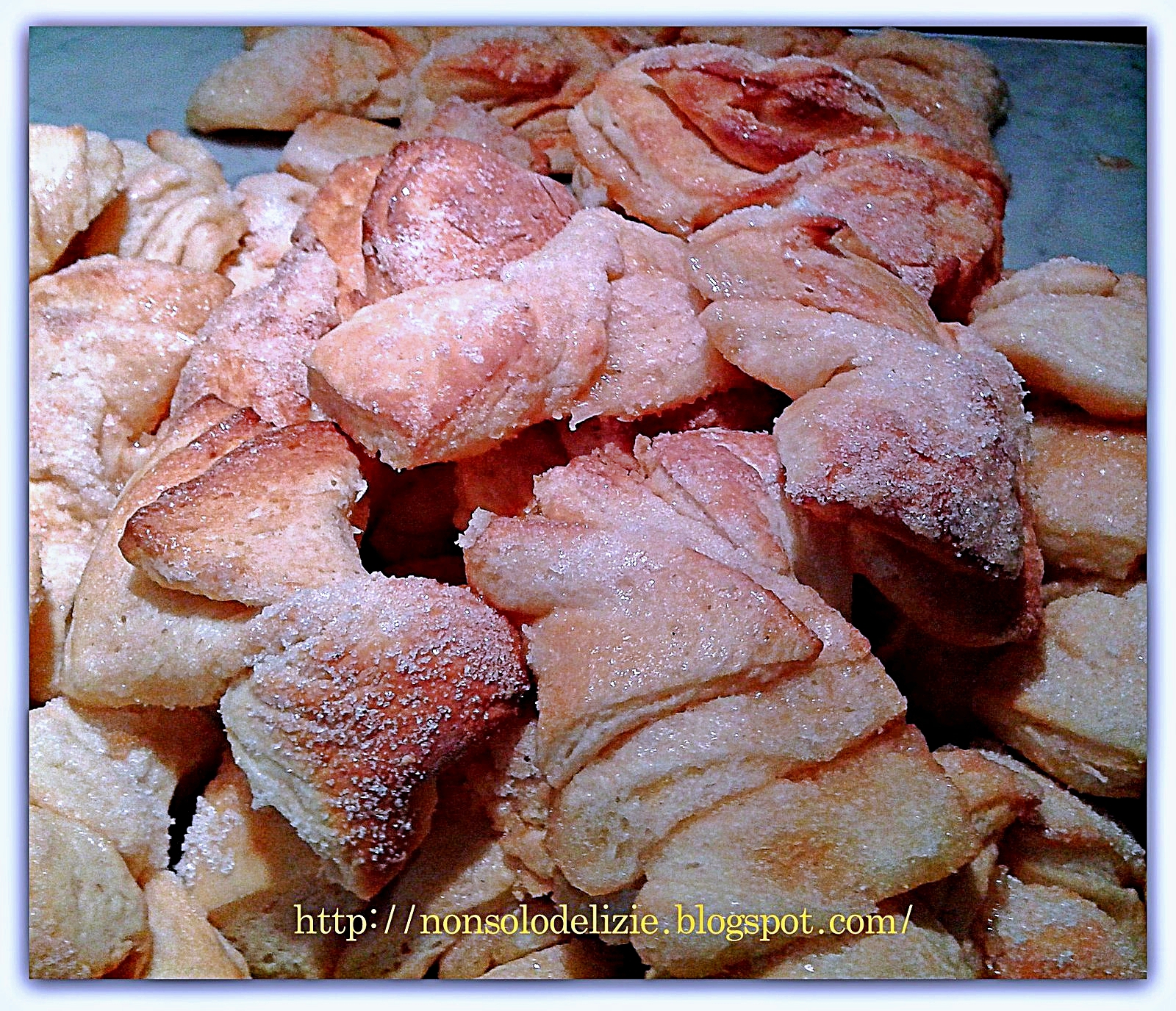 Nella planetaria, col gancio, mettere la farina, lo zucchero, il lievito, il miele e il latte e cominciare ad impastare a velocità 1,5; quando l'impasto si sarà formato risultando liscio, unite l'uovo, la fecola, l'acqua e fate impastare fino ad avere un composto molto elastico, liscio e bene incordato. A questo punto cominciate ad unire il burro morbido in piccole quantità e di volta in volta attendete che sia bene incorporato prima di unire il successivo; continuate fino ad aggiungerlo tutto e insieme all'ultimo unire anche il sale e gli aromi. Togliete l'impasto dal cestello della planetaria, dategli due o tre pieghe per dare forza al lievito madre, avvolgetelo nella pellicola alimentare e mettetelo in frigorifero per farlo raffreddare per bene, almeno un paio d'ore. Trascorso il tempo di raffreddamento, preparate la crema al burro, mettendo in planetaria a montare con la frusta, Il burro con lo zucchero a velo, il rhum e i semi della vaniglia fino ad ottenere una crema bianca, morbida e spumosa. Togliete L'impasto dal frigorifero, stendetelo quadrato di 50 cm. per lato con uno spessore di 2,5 cm., tagliatelo in 4 parti uguali, spalmate la superficie di 3 parti con la crema al burro, sovrapponetele una all'altra lasciando per ultima quella senza crema quindi rimettete in frigorifero per un'ora circa per fare rapprendere la crema. Riprendete il composto, stendetelo e tagliatelo in strisce di 2x4 cm., ruotate le due metà in senso opposto come a formare una farfalla, passate la superficie superiore nello zucchero semolato, mettete nelle teglie rivestite con carta da forno e cuocete a 180° a forno ventilato preriscaldato (io ho usato il programma per pasticceria) per circa 20 minuti, fino a fare dorare la superficie (provate sempre ad inserire lo stecchino di legno, che deve uscire asciutto, per controllare la cottura che può variare in funzione del proprio forno).