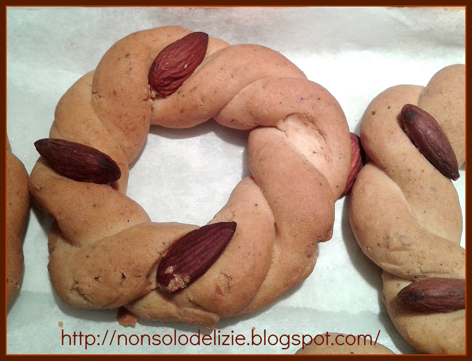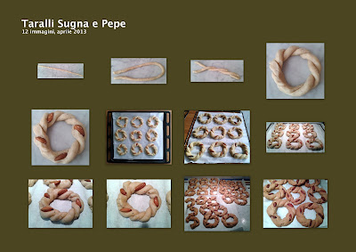 Nel cestello della planetaria (l'impasto può essere fatto anche a mano), mettere la farina setacciata, il sale, il pepe, lo strutto, il lievito sbriciolato e cominciare ad impastare; Aggiungere un poco di acqua tiepida e completare l'impasto che deve risultare morbido e friabile, come una pasta frolla. aggiungere le mandorle in granella e farle amalgamare per bene. Mettere il composto ottenuto a riposare per un'ora in frigorifero. Riprendere l'impasto, fare dei cordoncini sottili di circa 15 cm. di lunghezza, intrecciarli a due a due e chiuderli come ciambelle. Fare lievitare per un'ora quindi cuocere a forno ventilato preriscaldato a 180° per 25 minuti, fino a che la superficie risulti dorata. Sfornare e fare raffreddare su una gratella. Conservare in u barattolo ermetico o in una busta per alimenti.