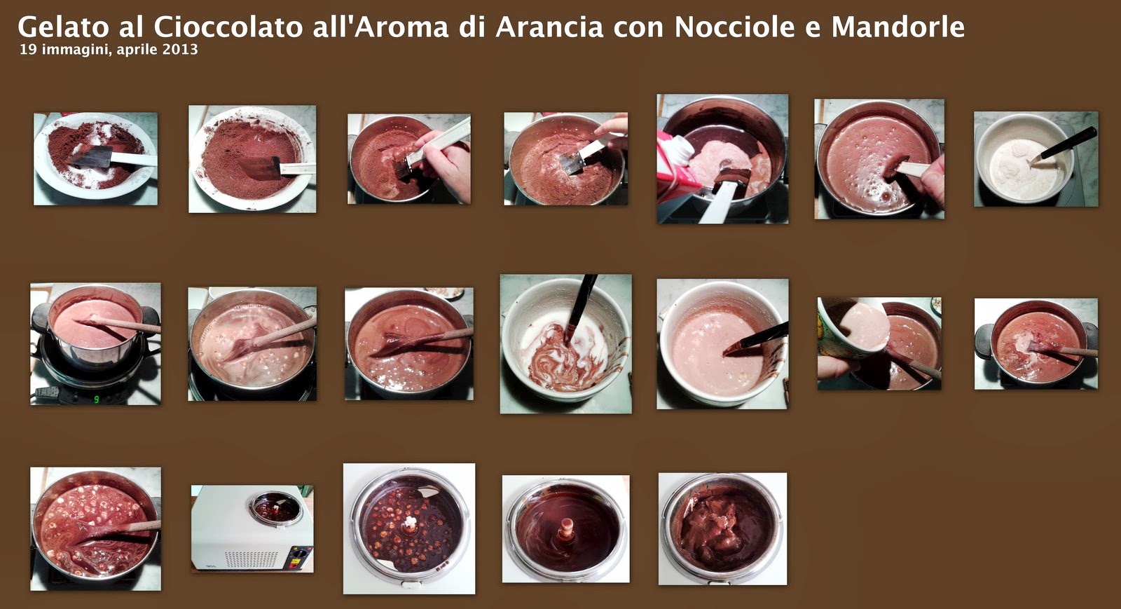 Innanzi tutto setacciate e mescolate insieme il cacao e lo zucchero, quindi aggiungete un poco di latte e cominciate a scioglierli lentamente (nei 900 gr. di latte), per evitare grumi, aiutandovi con una spatola. Quando le polveri saranno del tutto sciolte e ben amalgamate, mettete a cuocere in un pentolino. Intanto, a parte, sciogliete l'amido setacciato in 100 gr. di latte. Quando il composto sul fuoco raggiunge quasi l'ebollizione, toglietelo, versatene una piccola parte nel latte con l'amido, mescolate energicamente, quindi unite il tutto al resto del composto caldo. A questo punto, aggiungete le nocciole e le mandorle, amalgamate e fate raffreddare completamente il tutto, quindi versate nella gelatiera, avviate la macchina e seguite i tempi previsti dal programma.