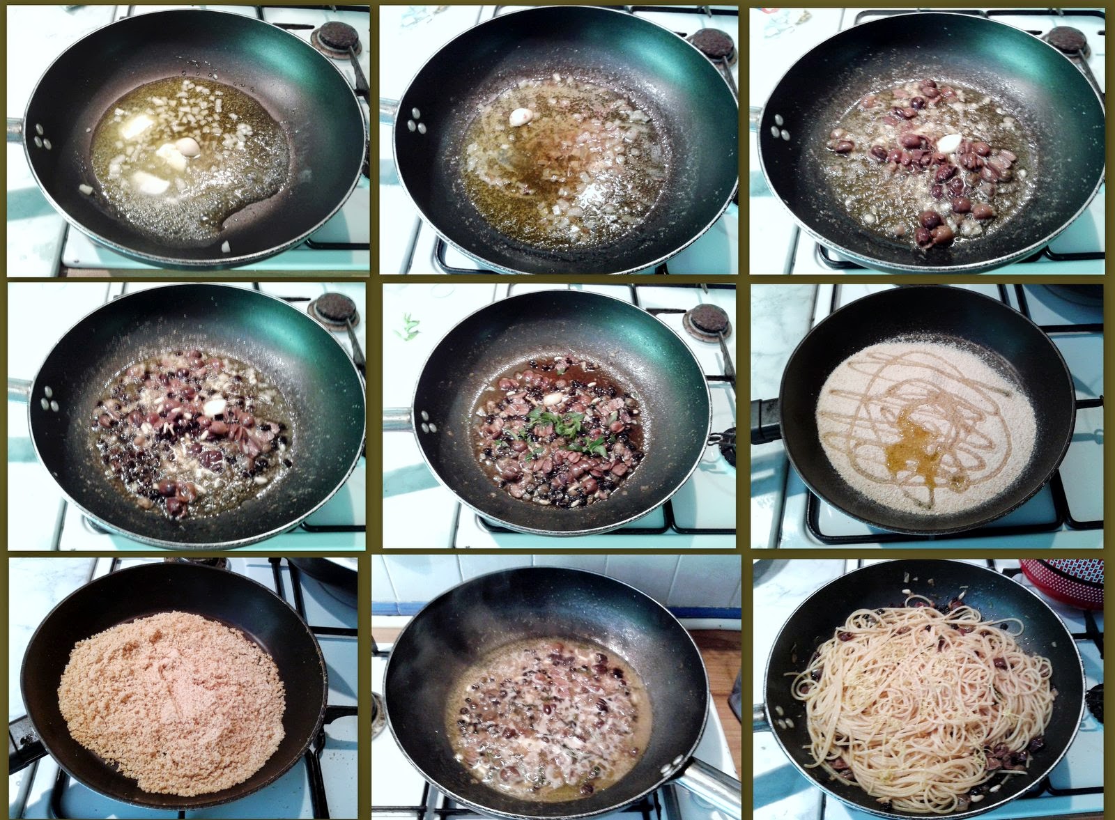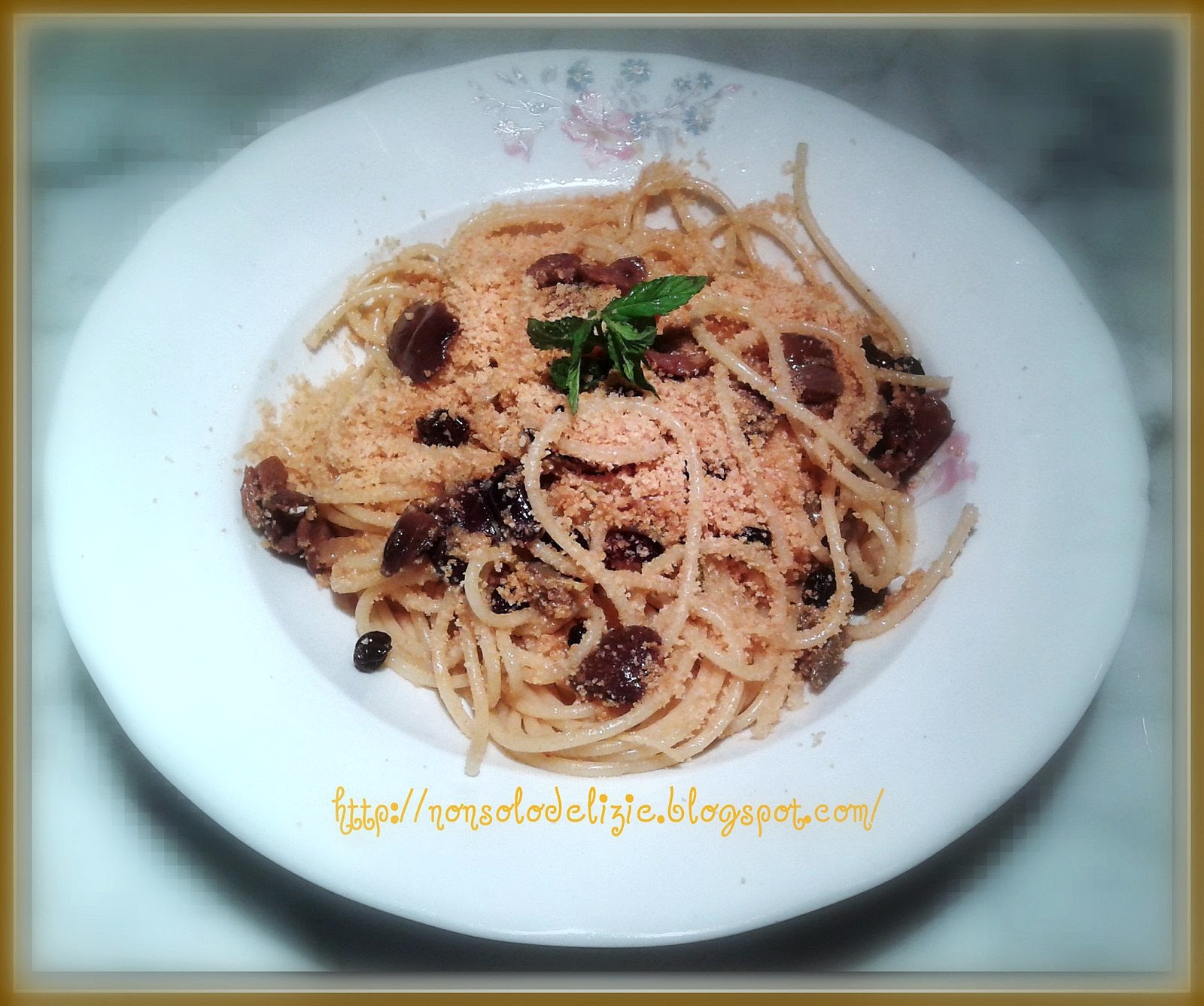 In una padella anti aderente mettete l'olio, il burro, l'aglio e il cipollotto e fate rosolare leggermente, quindi aggiungete le alici e fatele sciogliere per bene. Nel frattempo mettete a bagno i capperi per dissalarli, e, a parte, l'uva passa in acqua tiepida per farla rinvenire e per pulirla. Snocciolate le olive e aggiungetele agli altri ingredienti in padella; scolate e unite i capperi, l'uvetta sciacquata e privata dell'acqua, il peperoncino piccante, e fate insaporire per bene. Togliete dal fuoco e unite la mente spezzata con le mani (così facendo mantiene tutto il suo profumo e non si ossida). Mettete sul fuoco un'altra padella antiaderente e fate tostare il pan grattato con l'olio fino a renderlo dorato. Cuocete a parte gli spaghetti, lasciandoli al dente; metteteli in padella con gli altri ingredienti e con un poco di acqua di cottura, e fateli saltare. A questo punto, unite la bottarga e la buccia del limone grattugiata, girate il tutto in padella, togliete dal fuoco, spolverizzate col pan grattato tostato, decorate con un ciuffetto di menta fresca e servite ben caldo.