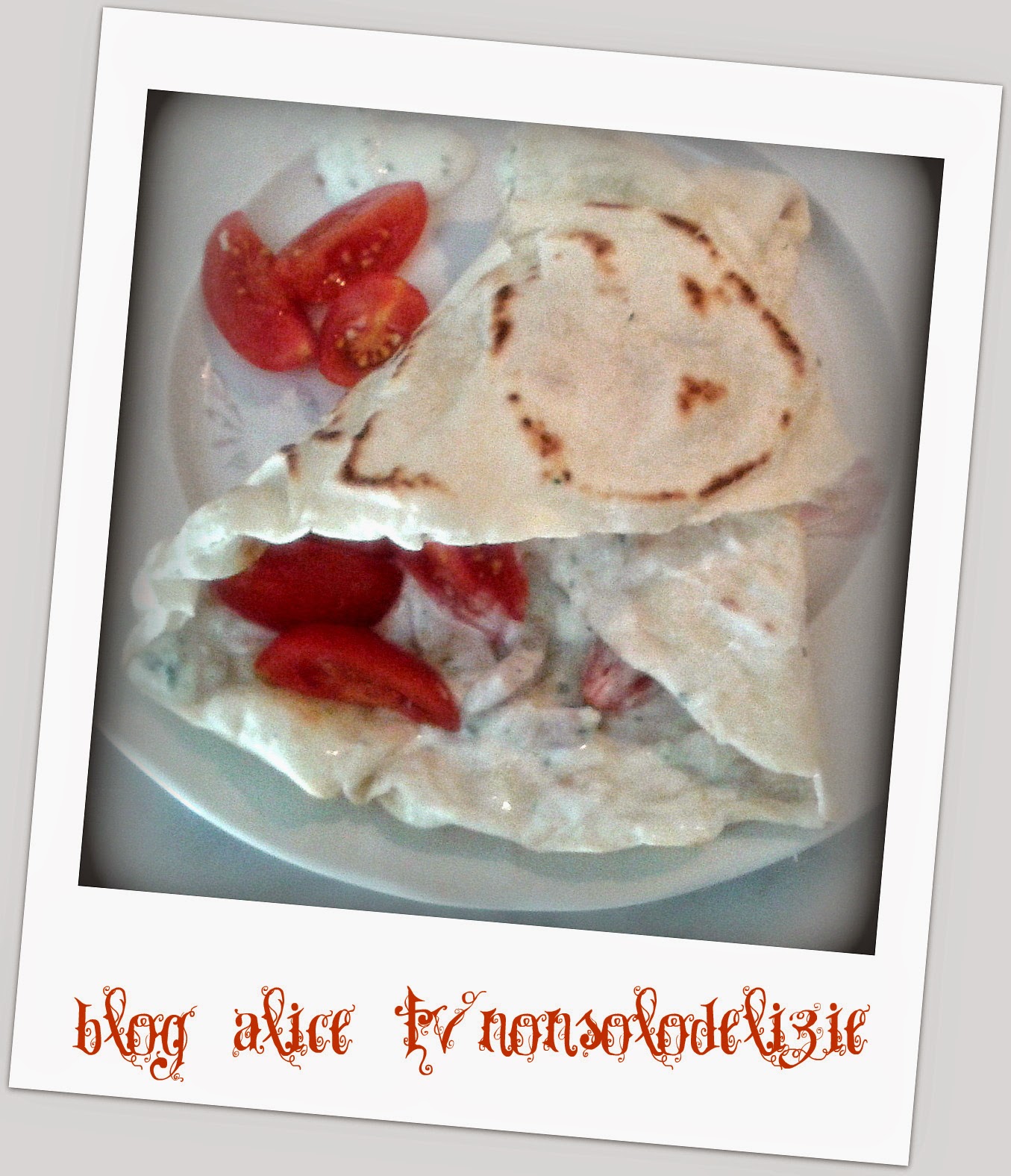 Lavate e grattugiate il cetriolo con tutta la buccia e l'aglio, privato dell'anima centrale, quindi mettetelo in un colino a sgocciolare per un paio d'ore, per far si che perda la parte liquida. Intanto preparate l'impasto per il pane mettendo in planetaria (potete farlo anche a mano) la farina setacciata insieme al lievito per dolci; azionate la macchina e aggiungete l'acqua a filo, per idratare bene la farina; mescolate per alcuni minuti e per ultimo unite il burro morbido in piccole quantità, pian piano, facendolo assorbire del tutto. Avvolgete l'impasto nella pellicola per alimenti e fatelo riposare per poterlo meglio lavorare in seguito. Riprendete il cetriolo ed eliminate l'acqua di vegetazione che ha perso, quindi unite il sale, l'olio, l'aceto e mescolate; per ultimo unite lo yogurt e miscelate bene il tutto fino ad ottenere una crema. Mettete in frigorifero fino al momento di utilizzarla. Riprendete l'impasto del pane formate delle palline e stendetelo molto sottile, quindi cuocetelo da entrambi i lati in una padella antiaderente ben calda, giusto il tempo che risulti asciutto (deve essere una cottura molto veloce, altrimenti rischiate di bruciarlo). Tagliate la carne a striscioline, i cosiddetti straccetti, e passateli in padella con un filo d'olio, insaporendoli con gli aromi per gli arrosti e aggiustando di sale, giusto il tempo di saldare la carne, quindi togliete dal fuoco e tenete da parte. Riprendete il pane arabo, stendete sulla superficie due o tre cucchiai di salsa tzatziki, mettete qualche foglia di insalata ben lavata e asciugata, alcune fette di pomodori, anch'essi puliti e asciutti, ( io non avevo, l'insalata e ho messo solo dei pomodorini tipo Pachino rossi e molto sodi), un poco di straccetti di carne e ricoprite con la salsa, quindi piegate e arrotolate su se stesso il pane. Procedete così anche per gli altri kebab. Servite con qualche pomodoro e un poco d'insalata.