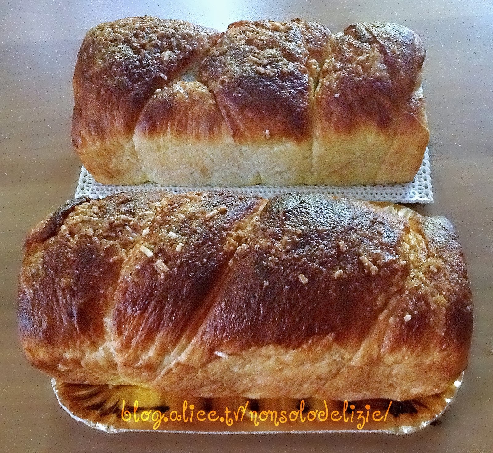 Nel cestello della planetaria mettete la farina setacciata, il latte e lo zucchero ed avviate la macchina a velocità 1. Fate girare per un paio di minuti quindi aumentate leggermente la velocità e aggiungete le uova, uno per volta; quando l'impasto sarà omogeneo, unite il lievito madre a pezzetti e fate impastare per bene fino a che sarà del tutto amalgamato col resto del composto, quindi unite il sale. Fate lavorare la planetaria a velocità sempre costante, fino a che l'impasto non risulterà bene incordato ed elastico, quindi valutate con le mani la consistenza e se dovesse risultare troppo compatto e tirato, unite ancora un poco di latte per idratarlo ulteriormente, poco per volta e molto lentamente, per non rompere la maglia glutinica che da l'incordatura. Impastate fino a che vedrete che si staccherà del tutto dalle pareti e solo a questo punto unite il burro morbido, sempre in piccole quantità, aspettando che sia incorporato del tutto prima di aggiungere il successivo, se non è abbastanza morbido, scaldatelo leggermente a microonde o a bagno maria e lavoratelo con una frusta fino a farlo ammorbidire del tutto ma non fondere, deve risultare cremoso. Completate l'impasto facendo lavorare la macchina ancora per 10 minuti circa quindi trasferitelo su una spianatoia leggermente imburrata e date 3 o 4 pieghe, come si fa per i cornetti, così da dare più forza al lievito madre per lavorare meglio; formate una palla e mettetela in una ciotola profonda, spennellata precedentemente con il burro fuso e coprite con la pellicola per alimenti, per mantenere all'interno la giusta umidità. Quando avrà raddoppiato il suo volume, dividete l'impasto in tre parti uguali, formate altrettanti cilindri e arrotolateli su se stessi, quindi metteteli negli appositi stampi da plumcake (io uso quelli in silicone che non devono essere né unti, né spolverizzati di farina); fate lievitare fino a raddoppiare nuovamente il volume, spennellate la superficie con il tuorlo sbattuto insieme al latte, spolverizzate abbondantemente e con lo zucchero semolato e con lo zucchero in granella, quindi cuocete a forno statico a 200° per 15 minuti, poi passate a ventilato e completate la cottura per altri 10 minuti circa (fate la prova stecchino per controllare la cottura, deve risultare asciutto.