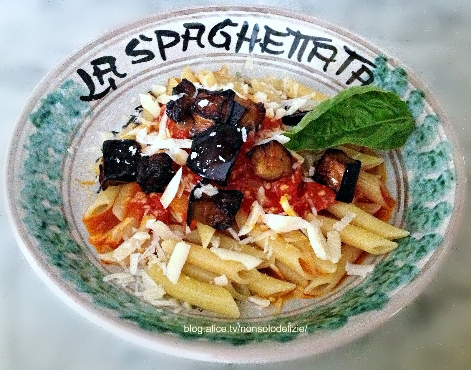 Preparate il sugo, facendo soffriggere, in un filo d'olio extravergine d'oliva, l'aglio privato dell'anima centrale e qualche foglia di basilico spezzata con le mani per evitare l'ossidazione e la perdita dell'aroma; aggiungete la passata di pomodoro e fate cuocere con un coperchio, il tutto a fiamma bassa fino ad ottenere un sugo molto denso, ci vorranno 15 minuti circa. Togliete dal fuoco e tenete da parte. Lavate la melanzana, asciugatela, privatela di una striscia di buccia, (tutto in tondo come si vede nella foto), tagliatela a cubetti e friggetela a fuoco alto fino a che non risulti ben dorata. Sgocciolatela per bene su carta assorbente. Fate cuocere la pasta, scolatela e conditela col sugo al basilico, mettete una manciata di cubetti di melanzana fritta, spolverizzate col formaggio in scaglie e aggiungete due foglioline di basilico fresco.