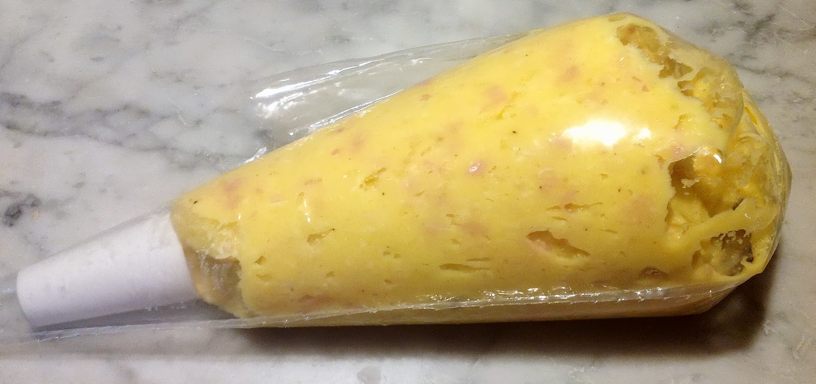 Iniziate col preparare la pasta choux o pasta per bignè, (ho utilizzato la mia ricetta, e non quella dello chef, che avendola già fatto tantissime volte mi da il pieno controllo sulla riuscita finale, ed è questo il motivo per cui ho utilizzata questa), mettendo sul fuoco un pentolino con l'acqua, il sale e il burro morbido a tocchetti; quando raggiungerà il bollore aggiungete la farina tutta d'un colpo e mescolate velocemente fino a che non si sarà formata una palla che si stacca dalla superficie del tegame. Togliete dal fuoco e fate raffreddare leggermente quindi unite le uova, uno alla volta, avendo cura di far assorbire del tutto il precedente prima di unire il successivo; tenete da parte. Lavate e bollite le patate, passatele nello schiaccia patate con tutta la buccia (velocizza il passaggio, la buccia resterà all'interno dell'attrezzo) e mettete la purea in una ciotola capiente; aggiungete la pasta choux, il grana, il sale il pepe, i tuorli ed amalgamare per bene, quindi unire il prosciutto e incorporatelo agli altri ingredienti. Mettete il composto in un sac a poche con la bocchetta. Fate scaldare l'olio e formate le crocchette, tagliando dei cilindri di 4 cm. di lunghezza direttamente al suo interno, facendole friggere a fuoco medio fino a completa doratura. Fate sgocciolare su carta assorbente, regolate di sale se necessario e servite. Nella decorazione del piatto, oltre alle crocchette e il ciuffo di prezzemolo, trovate anche un bignè fritto realizzato con gli avanzi della pasta choux che avete utilizzato nella ricetta ( a me ne sono risultati 10 che abbiamo consumato come dessert di fine pasto, semplicemente spolverizzati con dello zucchero a velo vanigliato).