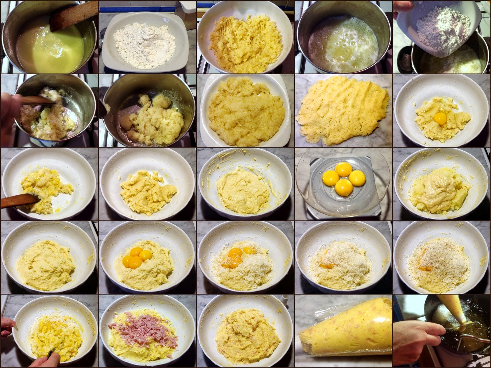 Per questo piatto mi sono ispirata alla ricetta delle Patate Dauphine, crocchette di patate e pasta chox insieme, che è stato, di recente, argomento di una lezione del grande Chef Luca Montersino nella sua "Accademia Montersino", una trasmissione che va in onda su Alice Tv, ch. 416 di Sky e che costituisce una vera e propria accademia di cucina e di pasticceria. Luca Montersino è il mio Maestro, molte delle mie conoscenze culinarie le ho acquisite seguendo le sue trasmissioni sin dalle sue prime apparizioni in tv e studiando sui suoi splendidi libri, dettagliati e molto chiari. La ricetta originale la trovate qui; la mia è una rivisitazione. La scelta di apportare delle modifiche non è certo dovuta al fatto che quella del Maestro non fosse già perfetta, ma è legata solo all'esigenza di dare un gusto diverso al prodotto finale che potesse piacere ancora di più ai miei figli, i miei critici più severi. E' di semplice esecuzione ed il risultato finale è delizioso. Provatela, ne vale veramente la pena!
