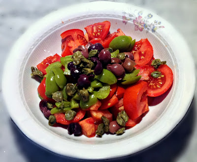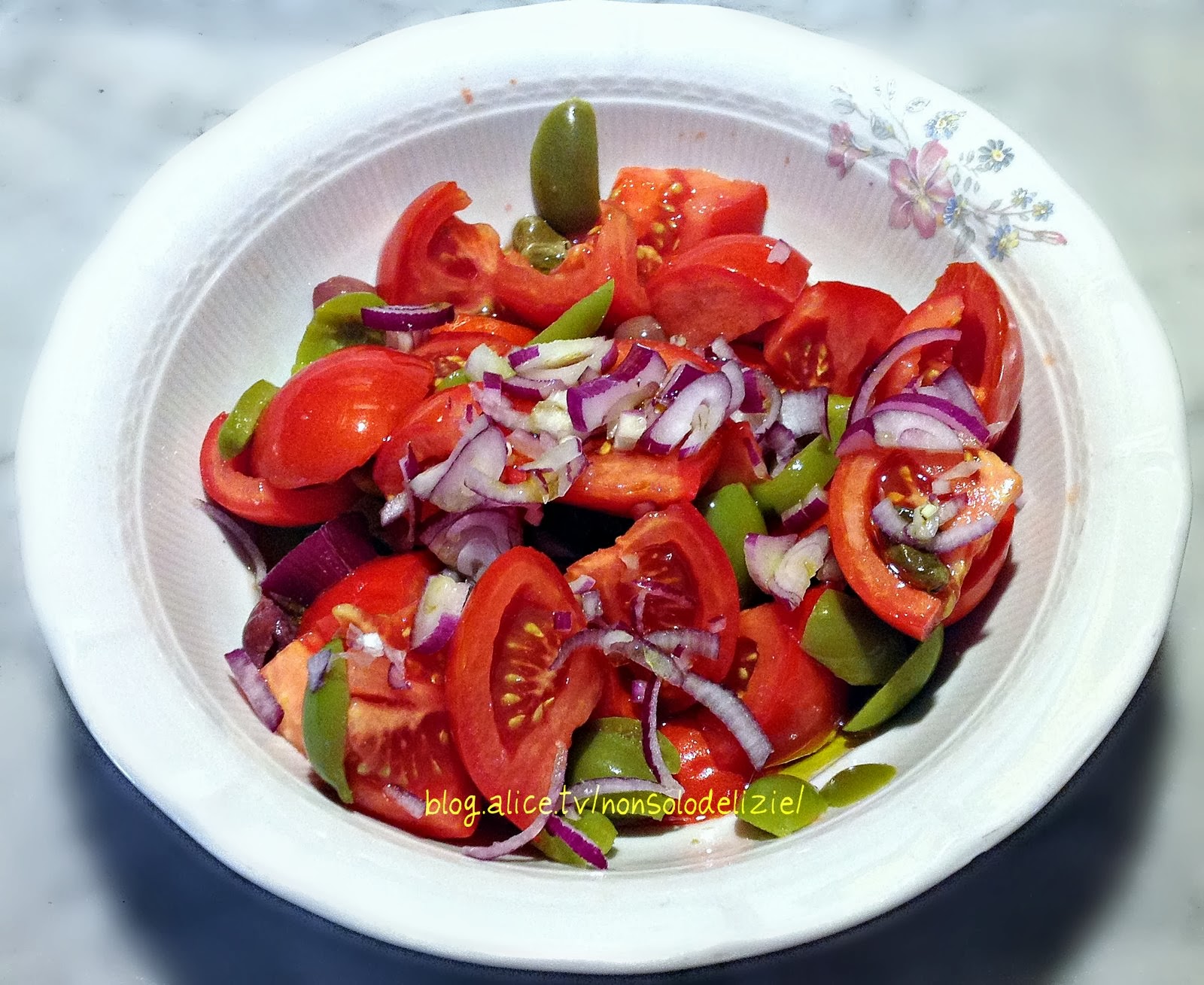 Lavate i pomodori e tagliateli a spicchi grandi, tagliate la cipolla a rondelle, dissalate i capperi e sciacquateli per bene, denocciolate le olive verdi e nere, lavate e sminuzzate il basilico e mettete il tutto in una ciotola grande, condite con sale, origano e olio, mescolate bene il tutto e servite.