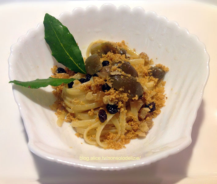 Lavate le foglie di alloro, spezzatele con le mani e mettetele a bollire in 5 o 6 cucchiai di acqua, per estrarre gli oli essenziali e tutto il suo sapore. Nella stessa acqua, ancora calda, mettete poi in infusione i pistilli di zafferano che serviranno a dare sapore e a colorare la pasta. In una padella antiaderente versate un filo d'olio e fate sciogliere al suo interno le alici; tagliate la cipolla e aggiungetela facendola soffriggere quel tanto che basta a renderla dorata quindi unite il liquido di infusione di alloro e zafferano per far si che la cipolla possa cuocere senza bruciare, rilasciando così tutta la sua dolcezza. Tagliate le olive privandole del nocciolo e mettetele in padella, unite i capperi che avrete fatto dissalare precedentemente e l'uva passa già lavata e ammollata; fate cuocere per 5 minuti, spegnete e tenete da parte. In un'altra padella antiaderente fate tostare il pan grattato con un poco d'olio, e quando sarà dorato spegnete e versatelo in un piatto per evitare che continui a cuocere col calore stesso della padella. Cuocete a parte le linguine, tenendole abbastanza al dente, scolatele e tenetele da parte. Sgusciate le noci, sminuzzate i gherigli e uniteli al resto degli ingredienti; rimettete la padella sul fuoco, fate scaldare, aggiungete le linguine, mezzo cucchiaino di bottarga, e fatele saltare fino a completa cottura. Mettete nel piatto, spolverizzate col pan grattato tostato ('a muddica), decorate con due foglie di alloro fresco e servite.