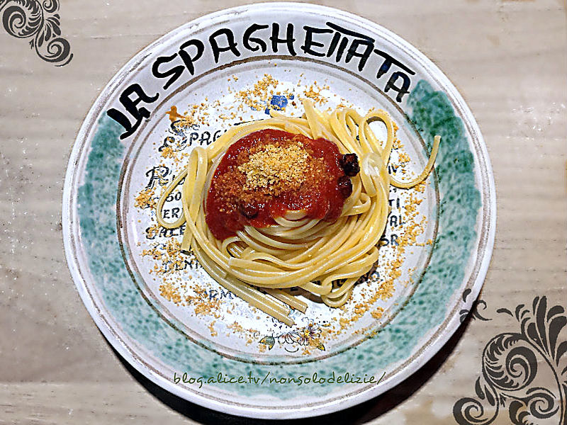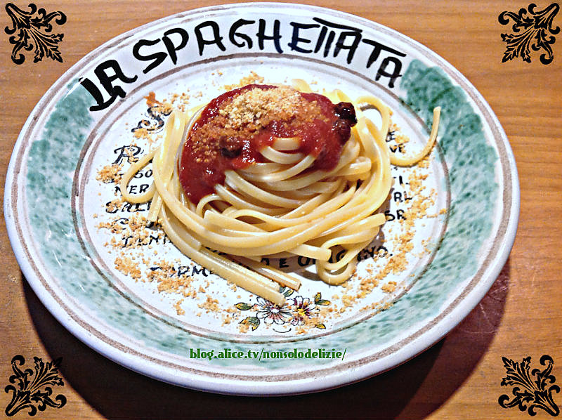 In un pentolino fate rosolare l'aglio privato dell'anima in un filo d'olio, aggiungete la pasta di acciughe e fatela sciogliere per bene quindi unite il concentrato di pomodoro e aggiungendo dell'acqua naturale, fatelo diluire pian piano fino ad ottenere la densità del sugo classico (potete usare come misurino dosatore la lattina stessa del concentrato di pomodoro mettendone circa due colme). Mettete a cuocere dopo avere aggiunto i pinoli e l'uva passa, lavata e fatta rinvenire precedentemente in acqua; dovrà cuocere a fiamma bassa per circa 30 minuti, o comunque fino a ottenere un sugo nuovamente ristretto e denso, girando di tanto in tanto per evitare che possa attaccare sul fondo. Contemporaneamente, in una padella antiaderente mettete il pangrattato, bagnate con l'olio e fate imbiondire a fiamma bassa, mescolando continuamente per evitare che si bruci. Spegnete e versate in un piatto, altrimenti il pangrattato continuerebbe la cottura con il suo stesso calore. Cuocete le linguine, scolatele, mettetele nel piatto di servizio, condite col sugo, spolverizzate col pangrattato tostato, bagnate con un filo d'olio e servite.
