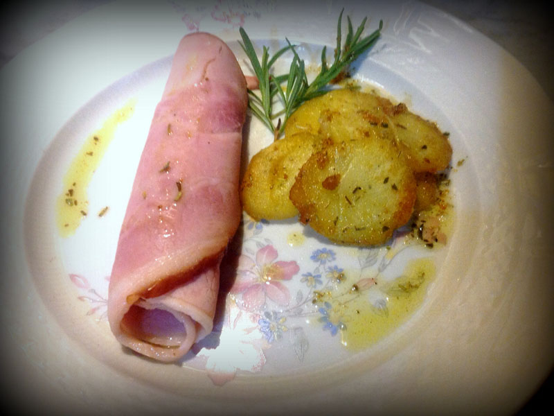 Pelate le patate, lavatele e tagliatele a fette tonde spesse 5 mm. In una padella antiaderente fate fondere il burro e fatelo amalgamare con l'olio extravergine di oliva. Mettete sul fuoco una pentola con acqua fredda, immergetevi le patate e portate ad ebollizione. Fate cuocere fino a farle ammorbidire e perdere una parte del loro amido, ci vorranno 8 - 10 minuti circa. Spegnete, scolatele, mettetele nella padella col burro, unite il rosmarino fresco tritato, gli aromi, regolate di sale e pepe e fatele cuocere a fiamma media, rigirandole di tanto in tanto con delicatezza per evitare di romperle, fino a che si dorino del tutto da entrambi i lati. Nel frattempo mettete le fette di prosciutto di Praga in una placca da forno spennellata con olio e fatele scaldare per qualche minuto per renderlo più profumato e saporito; arrotolatelo su se stesso, mettetelo in un piatto insieme a qualche patata al burro, un filo d'olio intorno, decorate con un rametto di rosmarino fresco per richiamare gli aromi inseriti nelle patate e servite.