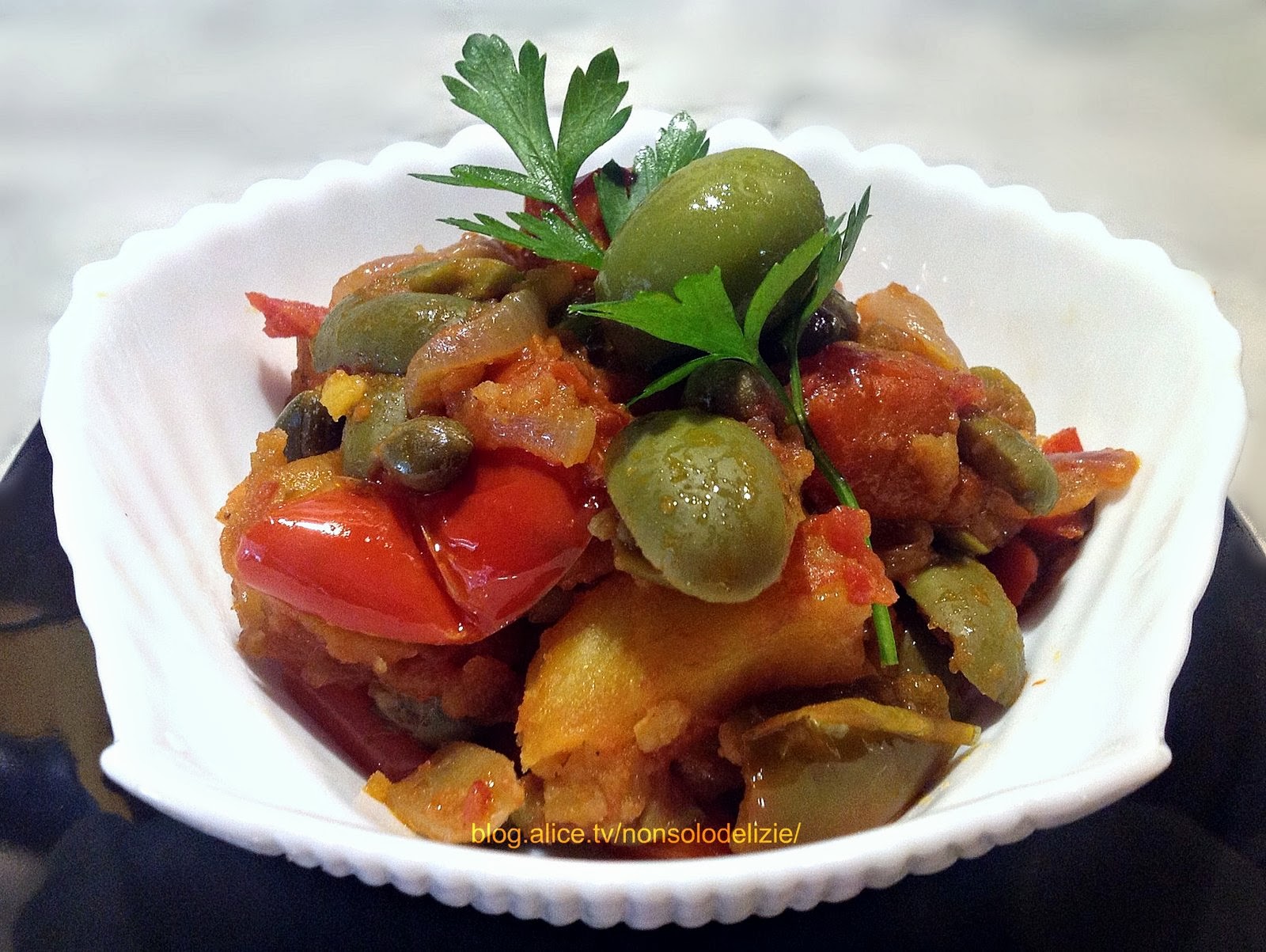 Lavate i peperoni, privateli dei semi e tagliateli a cubetti; sbucciate le patate, tagliatele a cubetti grandi e mettetele a bagno per almeno un'ora affinché perdano una parte del loro amido. Dissalate i capperi, snocciolate le olive e tagliate le cipolle a rondelle. In una padella dai bordi alti mettete l'olio, e cominciate a friggere a fiamma viva i vari ingredienti, prima le cipolle e poi aggiungete le olive e i capperi; fate cuocere fino a che si ammorbidiscano. Scolateli e metteteli in un tegame abbastanza capiente. Friggete poi i peperoni e per ultime le patate e mettete anche questi nello stesso tegame insieme ai pelati tagliati a pezzetti. In un bicchiere miscelate l'aceto, lo zucchero e il sale e versatelo nel tegame, unite un bicchiere di acqua e mettete a cuocere a fiamma bassa per 10 - 15 minuti fino a fare amalgamare bene il tutto e far cuocere i pelati. Fate raffreddare e servite.