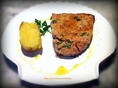 Lavate la patate e fatele lessare con tutta la buccia, scolatele e fatele raffreddare. Lavate il prezzemolo, asciugatelo per bene e tritatelo finemente; unitelo al pan grattato e passate al suo interno il tonno da entrambe le parti. Mettete sul fuoco una padella antiaderente e fatela riscaldare per bene, quindi inserite una fetta di tonno per volta e fatela cuocere da entrambi i lati per circa 5 minuti per parte ( deve risultare dorato fuori ma rosato dentro, altrimenti diventa stopposo). Tagliate a metà per il lato più lungo la patata che avevate cotto precedentemente, mettetela in un piatto di servizio, affiancatela con una fetta di tonno prezzemolato, decorate con un ciuffo di prezzemolo fresco e con un filo di olio extravergine di oliva e il piatto è pronto.