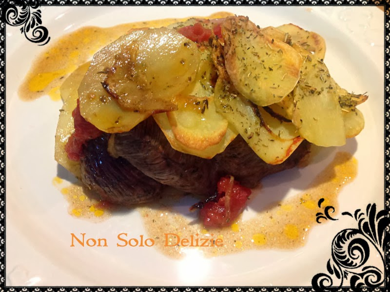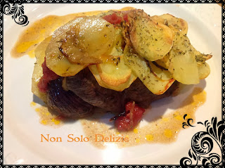 Pelate le patate e le cipolle e mettetele a bagno in acqua fredda per un paio d'ore, scolatele, asciugatele con un canovaccio pulito e tagliatele a fette rotonde sottili, con una mandolina. Ungete una placca da forno e fate un primo strato di patate, coprendo tutti gli spazi, insaporite con gli aromi, il pepe, il sale, l'origano, i pelati tagliati a cubetti, unite la cipolla tagliata a fettine sottili e bagnate con un filo d'olio; sovrapponete le fette di carne, salate, pepate e aromatizzate come avete fatto precedentemente, bagnate con un filo d'olio e ricoprite con l'ultimo strato di patate, cipolle, pomodoro, origano, sale, pepe, aromi e olio. Cuocete a forno ventilato a 200° per 20 minuti circa e servite.