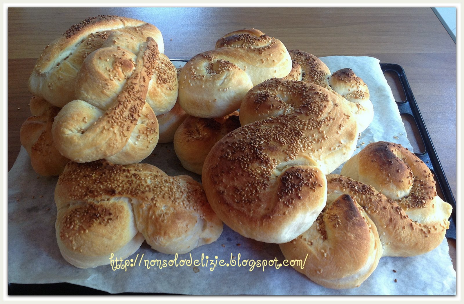 Nel cestello della planetaria mettete la farina setacciata e l’acqua e avviate la macchina a velocità 1. Quando l’impasto si sarà formato aggiungete il lievito madre a pezzetti e fatelo bene inserire nel composto. Fate lavorare la macchina fino a che l’impasto risulti ben amalgamato, quindi unite il sale. Aumentate un poco la velocità e fate lavorare la macchina fino a che l’impasto non sia del tutto incordato, ci vorranno circa 20 minuti, quindi trasferite il composto su una spianatoia spolverizzata di farina, fate qualche piega per dare più forza al lievito, (cioè ripiegate più volte la pasta su se stessa), fate una palla e lasciatela lievitare per 60 minuti, coperta con un canovaccio pulito e asciutto. Trascorso il tempo dividete l’impasto in dieci parti uguali, formate dei cilindri e quindi ripiegate come è mostrato nelle foto,quindi spennellate la superficie con olio extravergine di oliva e spolverizzate con il sesamo pigiando leggermente per farlo meglio aderire. Fate lievitare nelle teglie rivestite con carta da forno, sempre coperti con un canovaccio asciutto per circa 30 minuti, fino al raddoppio del volume, e cuocete a forno statico preriscaldato a 200° per circa 25 minuti mettendo un pentolino con acqua bollente all’interno del forno per creare la giusta umidità. Sfornate solo quando la superficie risulterà dorata.