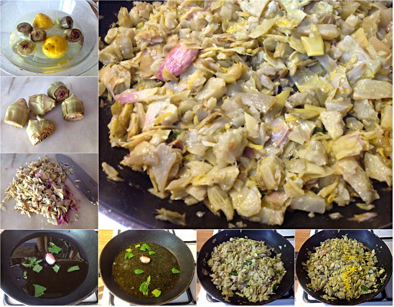 Pulite i carciofi, eliminate le parti più esterne e coriacee e le punte, strofinateli con il limone per evitare che si scuriscano e fateli bollire in acqua e limone fino a che si saranno ammorbiditi, quindi sminuzzateli,