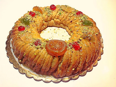 Cuocete a forno preriscaldato a 180° per circa 40 minuti ( per la cottura regolatevi sempre in base al vostro forno), cioè fino a che la superficie non risulti ben colorata, quindi sfornate e spennellate l'intera superficie con il miele mischiato alla marmellata d'arancia, scaldandoli insieme prima dell'utilizzazione, per facilitarne la distribuzione sulla superficie; spolverizzate coi pistacchi in granella e decorare a piacere con la frutta candita.
