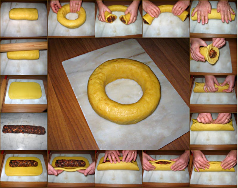 Trascorso il tempo prendete la pasta frolla dal frigorifero, impastatela per qualche minuto per renderla nuovamente plastica, quindi stendetela, dandole la forma rettangolare dello spessore di 5mm.; mettete al suo interno il ripieno preparato precedentemente, avvolgete a cilindro facendo combaciare i lembi esterni e con movimento dall'interno verso l'esterno, ridurre il diametro cilindrico e allungare il rotolo fino ad ottenere la lunghezza necessaria per poterlo piegare su se stesso formando una ciambella.