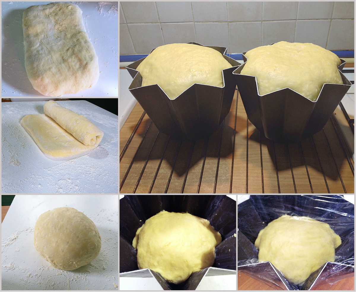 Dopo l'ultimo riposo, stendete nuovamente ciascun impasto, arrotolatelo su se stesso e poi ripiegatelo pian piano verso sotto, girandolo contemporaneamente per arrotondarlo (questa operazione deve essere fatta molto velocemente per evitare di riscaldarlo). Inserite le sfere così ottenute negli stampi appositi, spennellati precedentemente con burro fuso, coprite con pellicola alimentare e fate lievitare al caldo per 6 - 8 ore circa fino a che non raggiungano il bordo dello stampo (io li metto in forno spento con la pentola con coperchio che contiene acqua bollente che mantiene il calore), gli ultimi 30 minuti fate lievitare scoperti in modo che si formi la pellicina. Cuocete a 170° in forno preriscaldato statico per 60 minuti circa, la temperatura interna, che potrete controllare con un termometro per pasticceria, deve raggiungere i 96° (i tempi dipendono dal forno che si utilizza). Se crescendo dovessero rischiare di bruciarsi, avvicinandosi troppo alle resistenze superiori del forno, copriteli con la stagnola. Sfornate e fate raffreddare i pandori completamente, prima di toglierli dagli stampi.