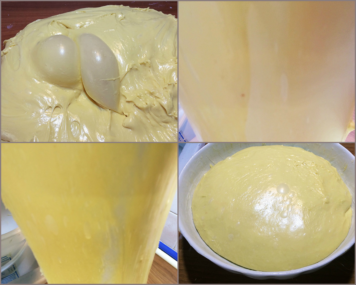 Primo impasto: Sciogliete lo zucchero nell'acqua, versatelo nel cestello della planetaria, aggiungete il lievito madre e fatelo idratare, avviando la planetaria a velocità 2 con la foglia. Aggiungete la farina, e sostituite il gancio alla foglia, continuando ad impastare sempre alla stessa velocità (durante tutto il procedimento, è importante tenere sotto controllo la temperatura del composto che non dovrà superare i 26°, altrimenti si "straccerà" perdendo la sua elasticità; se dovesse aumentare di temperatura, fermate la planetaria e trasferite la ciotola col suo contenuto e il gancio in congelatore per 5 minuti). Una volta che il composto acquisterà elasticità e si staccherà dalle pareti, cominciate ad aggiungere i tuorli, leggermente sbattuti, poco per volta, senza inserire il successivo prima che il precedente sia stato assorbito del tutto. Fate incordare bene l'impasto, e prima di procedere fate la prova del "velo" cioè, prelevate un pezzettino di impasto e tirate per vedere se resta elastico e diventa trasparente senza rompersi. A questo punto potete iniziare ad aggiungere il burro in pomata (se dovesse risultare duro, passatelo 30 secondi al microonde e poi lavoratelo leggermente con una spatola), sempre poco per volta aspettando che sia del tutto incorporato prima di aggiungere il successivo; in ultimo unite il sale. Fate impastare ancore per 5 minuti circa, fino a che sarà perfettamente incordato e togliete dalla planetaria. Passate del burro sulla spianatoia, ungetevi le mani, date qualche piega all'impasto per dare forza al lievito di lavorare, pirlate (fate rotolare il composto per dargli una forma sferica), mettetelo in un contenitore ermetico ben chiuso, segnate il livello per poter controllare lo sviluppo e mettetelo a lievitare in forno a una temperatura costante per 12 ore fino a che no avrà triplicato il suo volume (io gli inserisco vicino una pentola chiusa col coperchio, contenente acqua bollente, per mantenere la temperatura durante la notte).