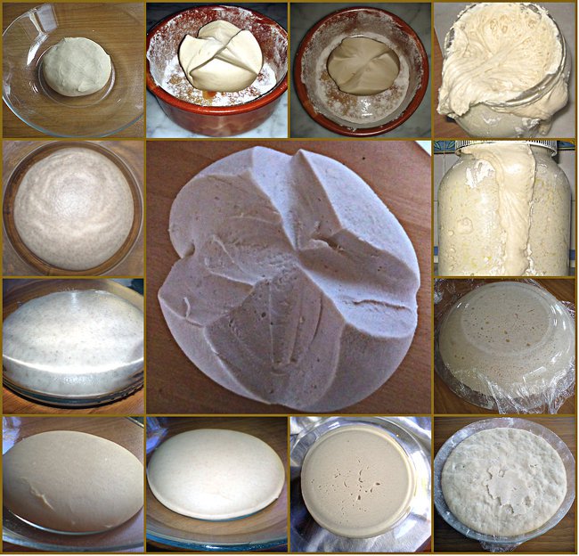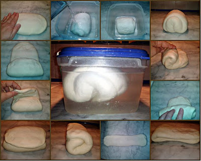 Affrontiamo un altro metodo di conservazione del Lievito Madre. Innanzi tutto rinfrescate il lievito, prelevando il cuore, pesandolo e aggiungendo uguale peso in farina e il 43% di acqua (ovviamente parliamo di una farina di media forza tipo 0 se usiamo il nostro lievito prevalentemente negli impasti per pizze e focacce, oppure una farina forte tipo Manitoba, se lo usiamo per dolci con impasti a grandi lievitazioni, tipo panettone, colomba, ecc.). Se per esempio, rinfrescate 100 gr. di lievito, dovete aggiungere 100 gr. di farina e 43 gr. di acqua, impastate bene il tutto fino ad ottenere una massa liscia e omogenea, quindi date qualche piega (come potete vedere nelle immagini sottostanti), dopo l'ultima piega lo arrotolatelo su se stesso fino ad ottenere un cilindro, e mettetelo in un contenitore ermetico, immergendolo per 2/3 in acqua. Chiudete il coperchio e mettete il lievito in frigorifero fino al rinfresco successivo. Questo metodo di conservazione forse richiede più costanza e attenzione, in quanto se il lievito dovesse restare troppo a lungo in acqua senza essere rinfrescato si scioglierebbe letteralmente, ma è pur vero che così tenuto è sempre pronto per essere utilizzato, senza dovere fare rinfreschi ravvicinati ogni tre ore prima dell'utilizzo per impasti di forza, non inacidisce mai perché l'acqua possiede un ph neutro e quindi, in tali circostanze, i batteri trovano le migliori condizioni per svilupparsi, senza dare al lievito quel sentore acidulo che potete percepire in quello che invece viene tenuto all'asciutto e quindi, lavorando nelle migliori condizioni, il lievito madre acquista ancora più forza. Inoltre, con questo metodo si evitano sprechi inutili di farina, in quanto, tenendolo immerso nell'acqua e in un contenitore chiuso, la parte esterna del lievito non si secca e non viene attaccata da batteri e polveri dell'ambiente esterno e quindi può essere utilizzato totalmente, senza dovere scartare la parte più esterna come si fa di solito.Consigli